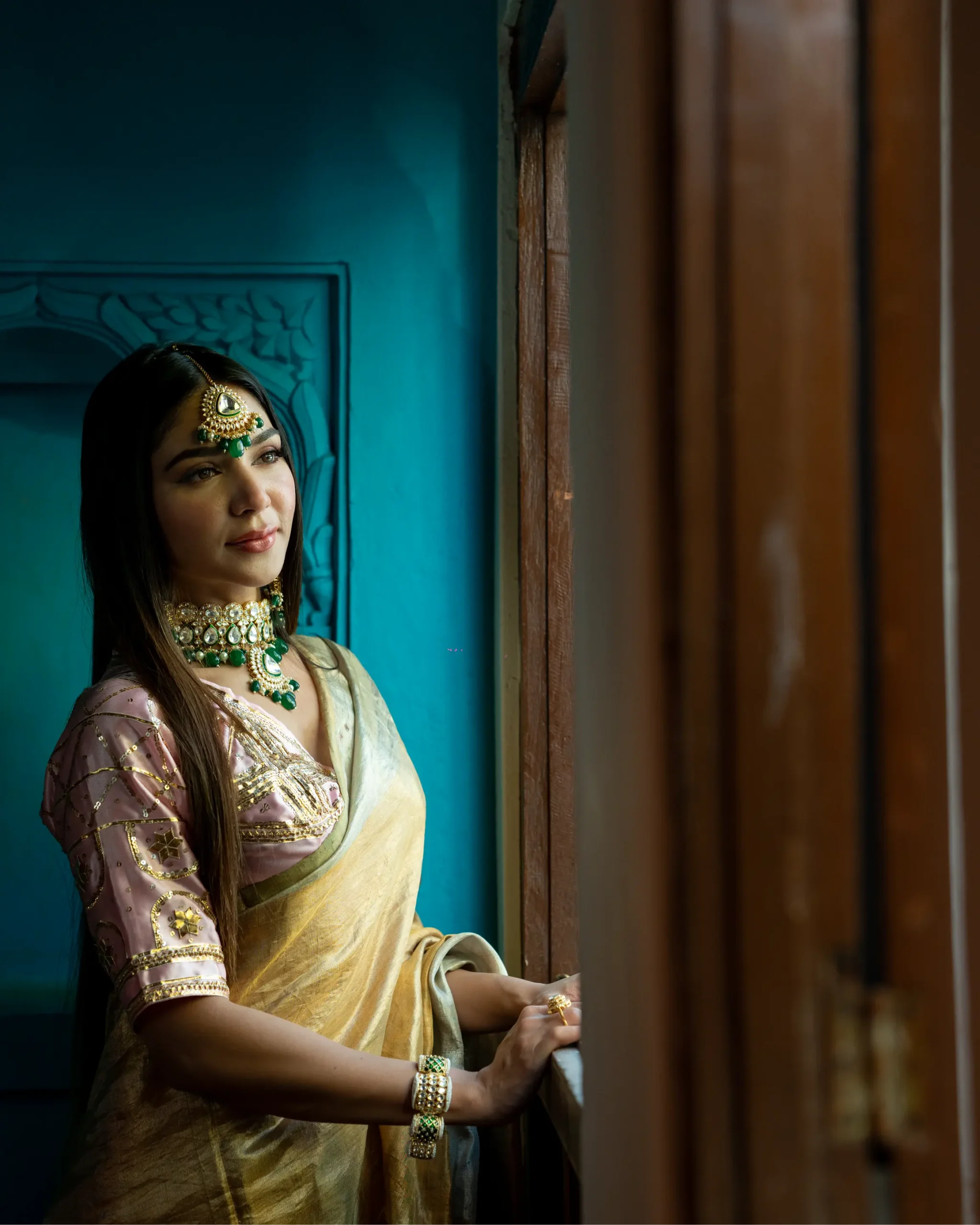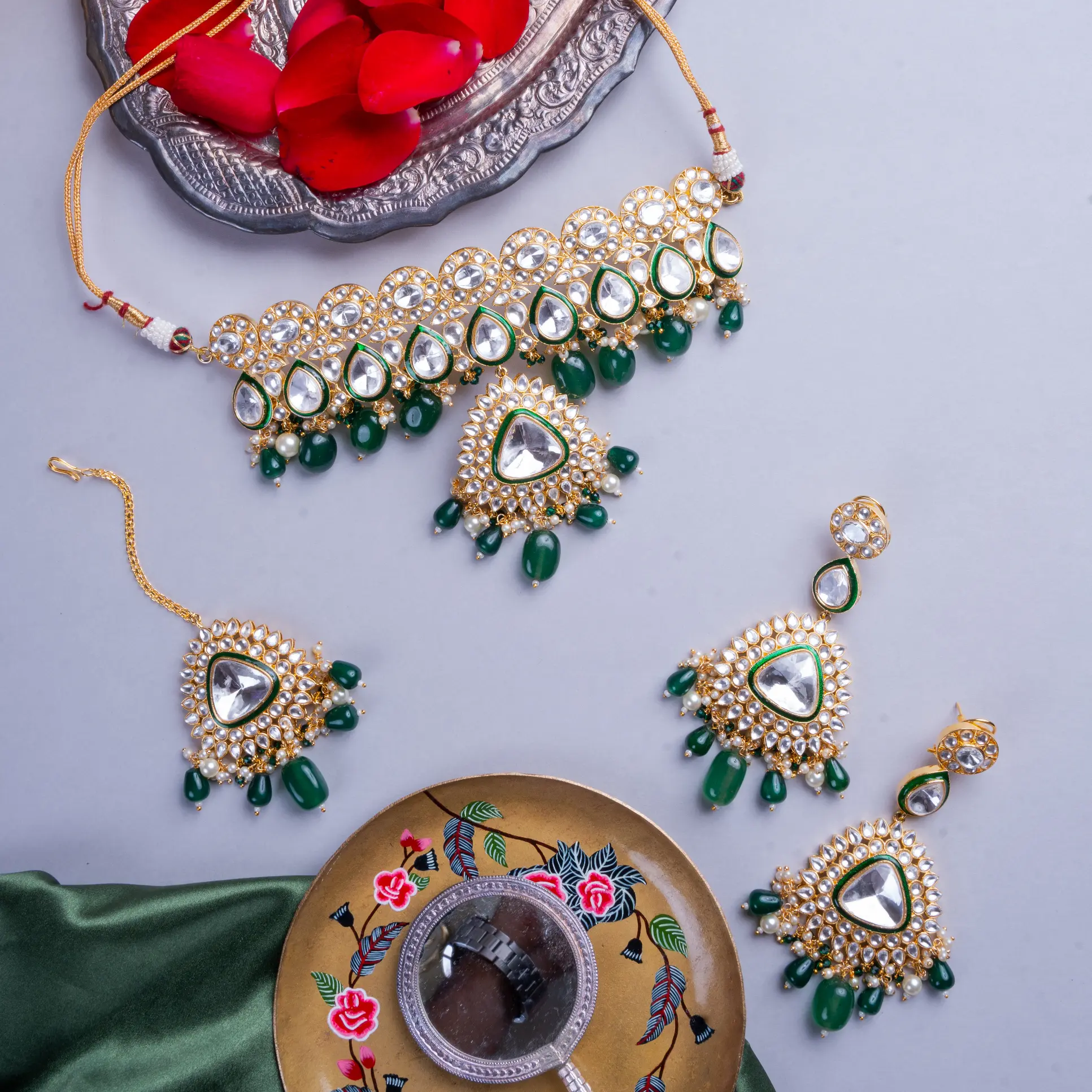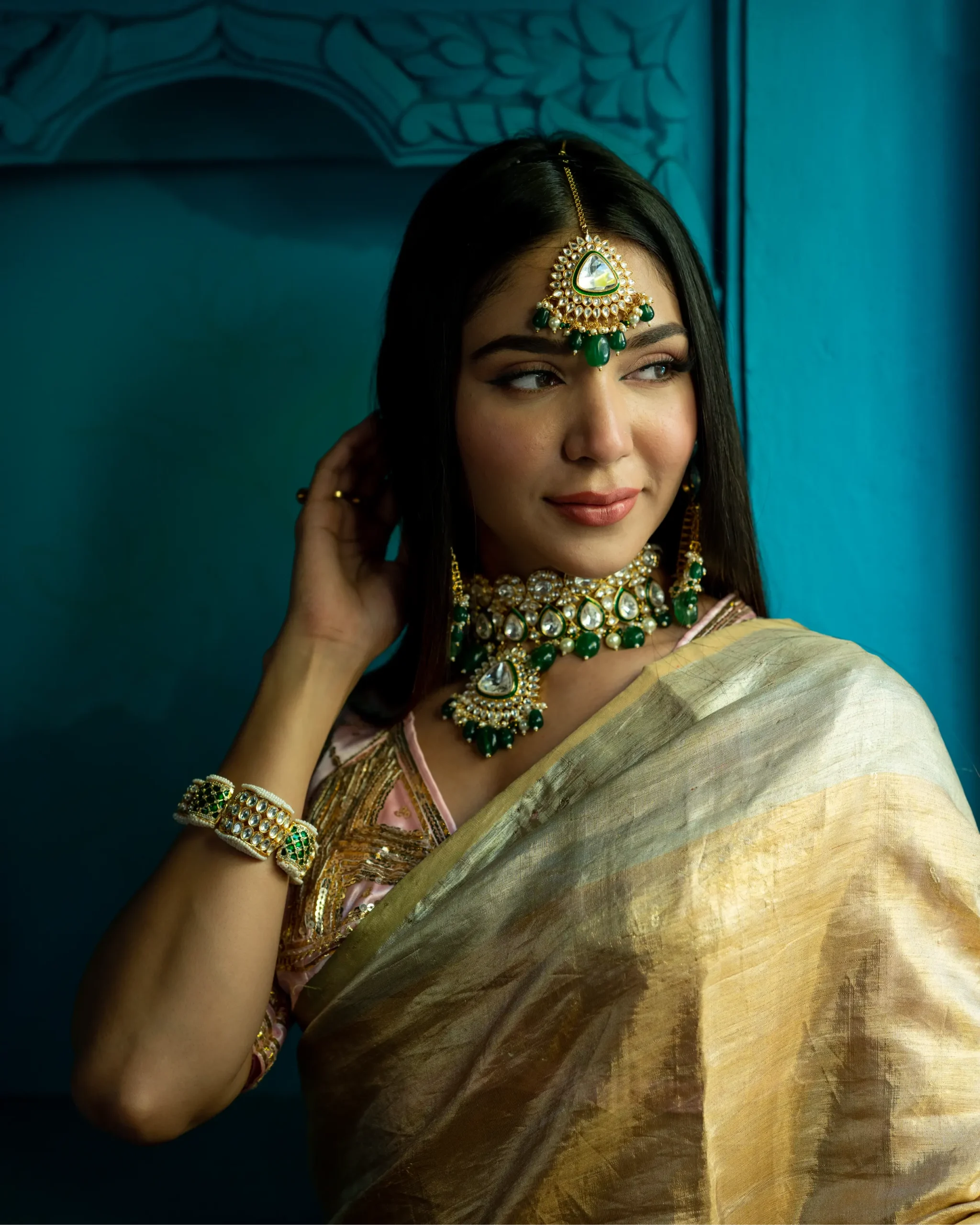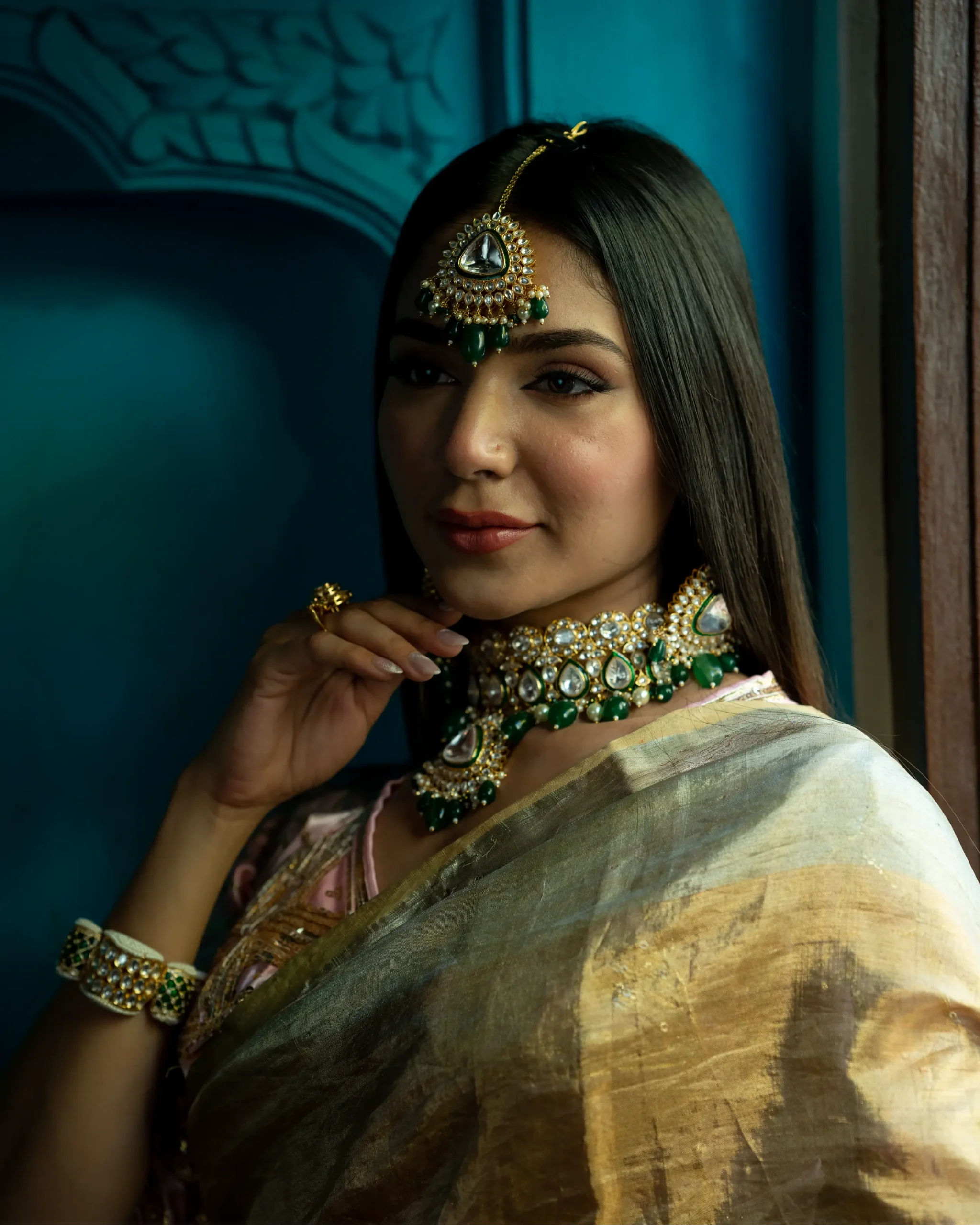 This emerald and polki set turns every glance into admiration. Designed to make you glow with effortless grandeur.