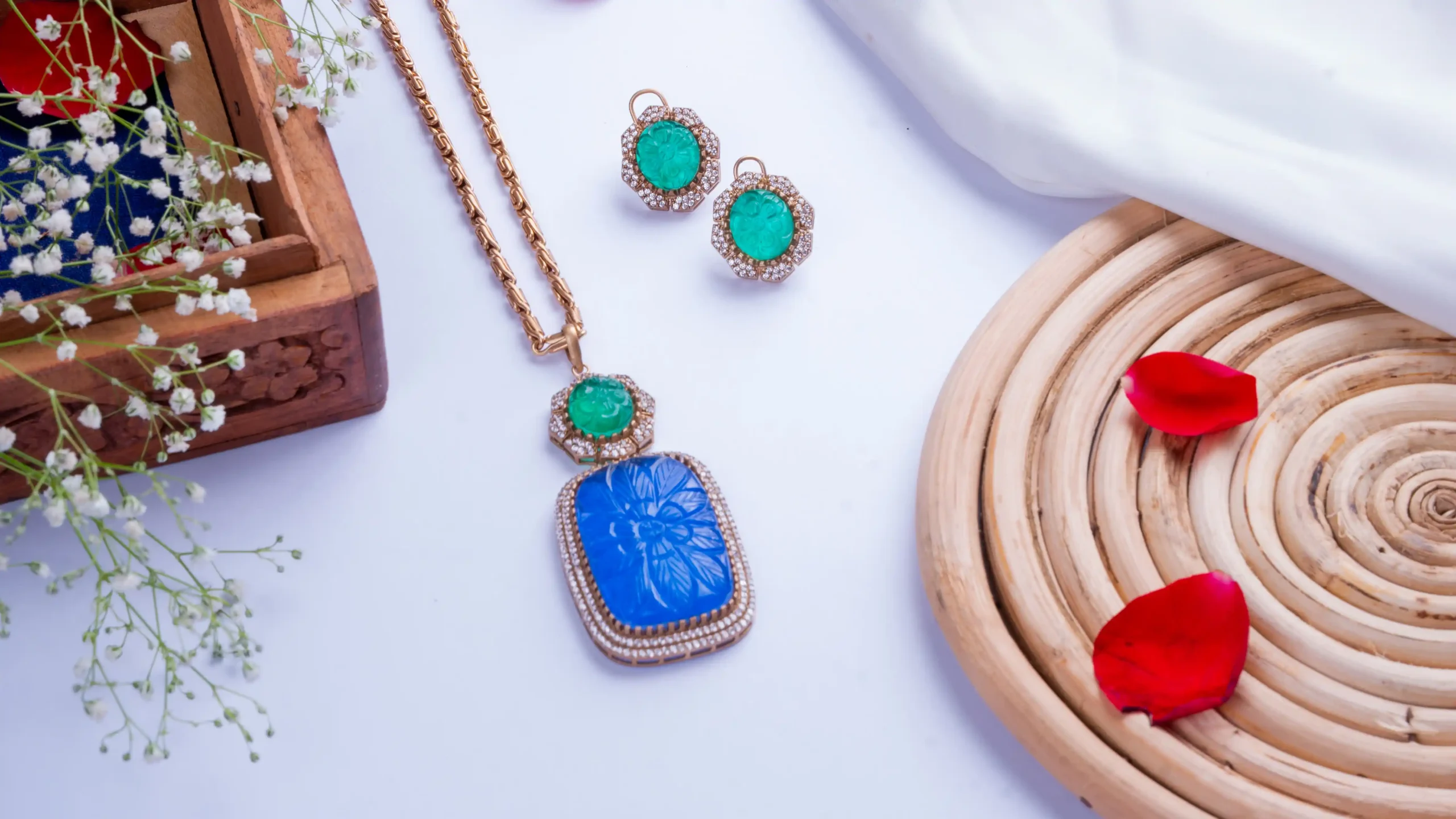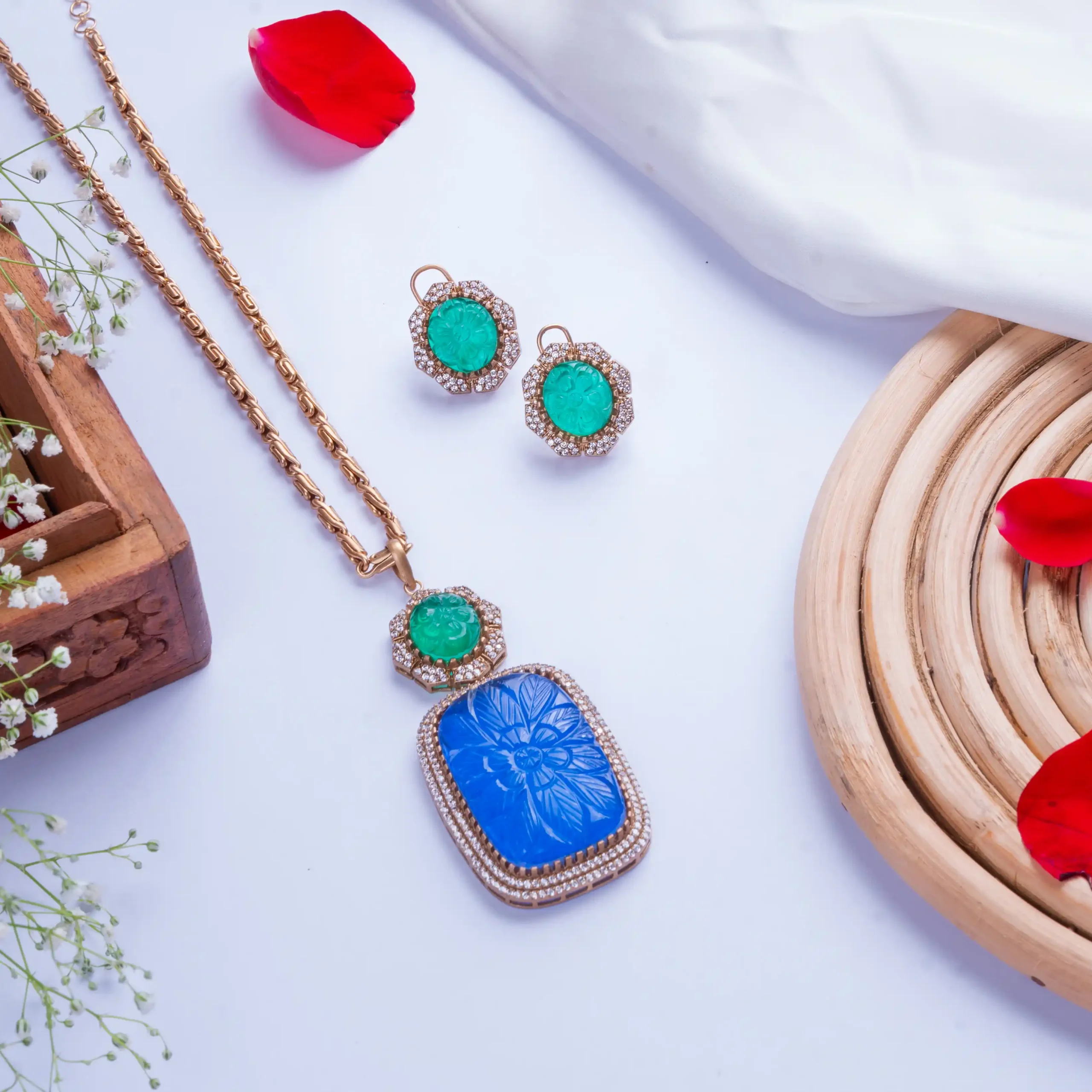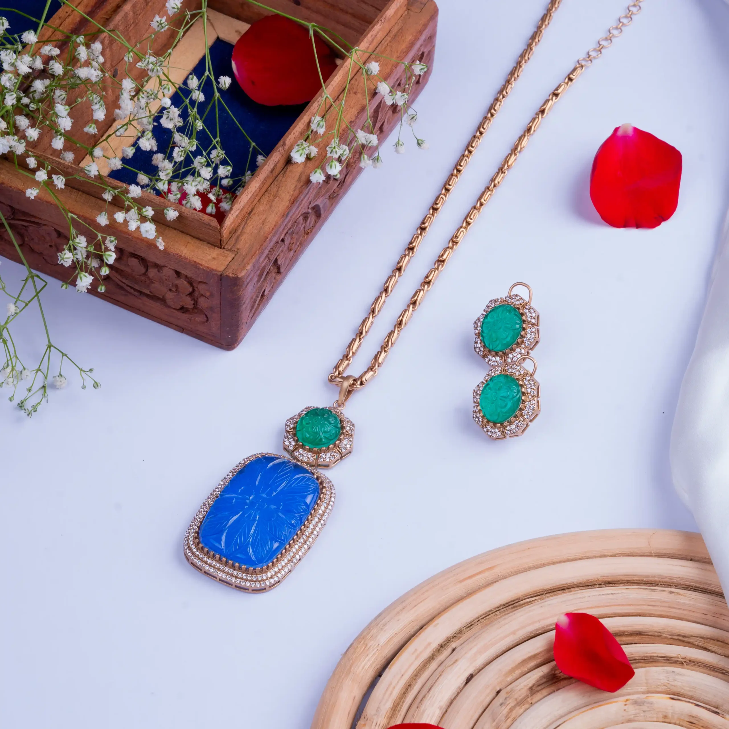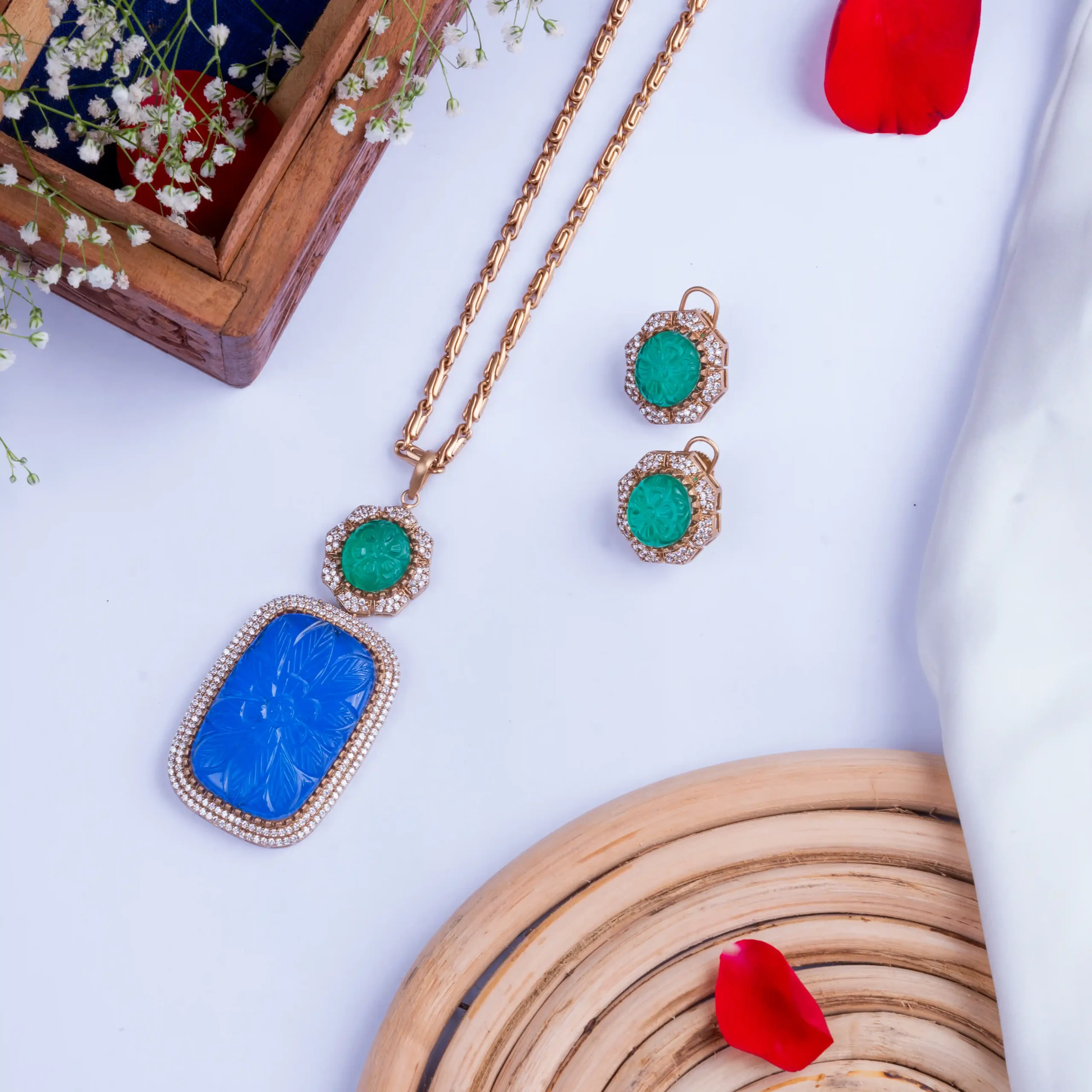 A bold fusion of royal blue and emerald green, carved stones and pavé crystals—this pendant set is unapologetically luxurious with a vintage dynasty vibe.
