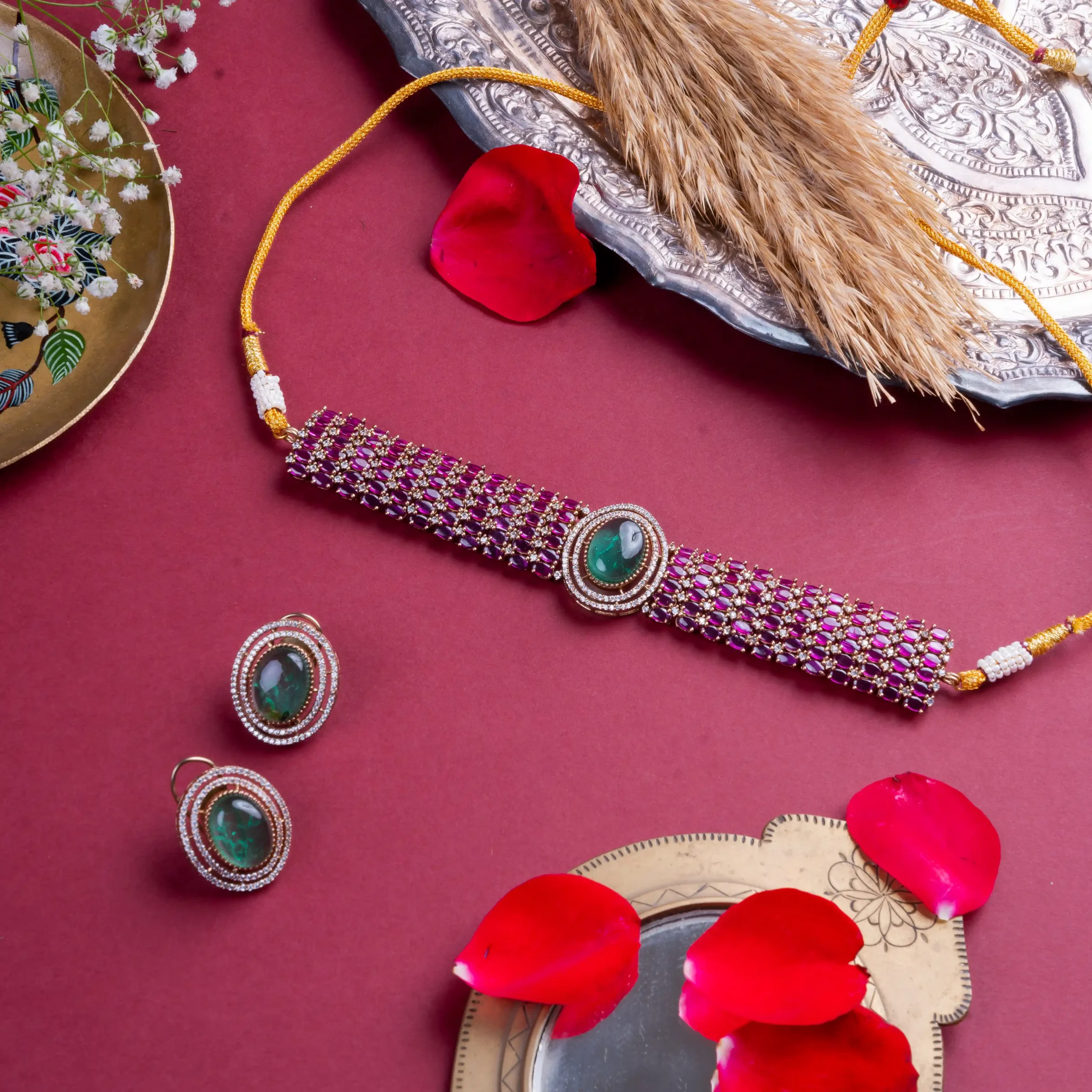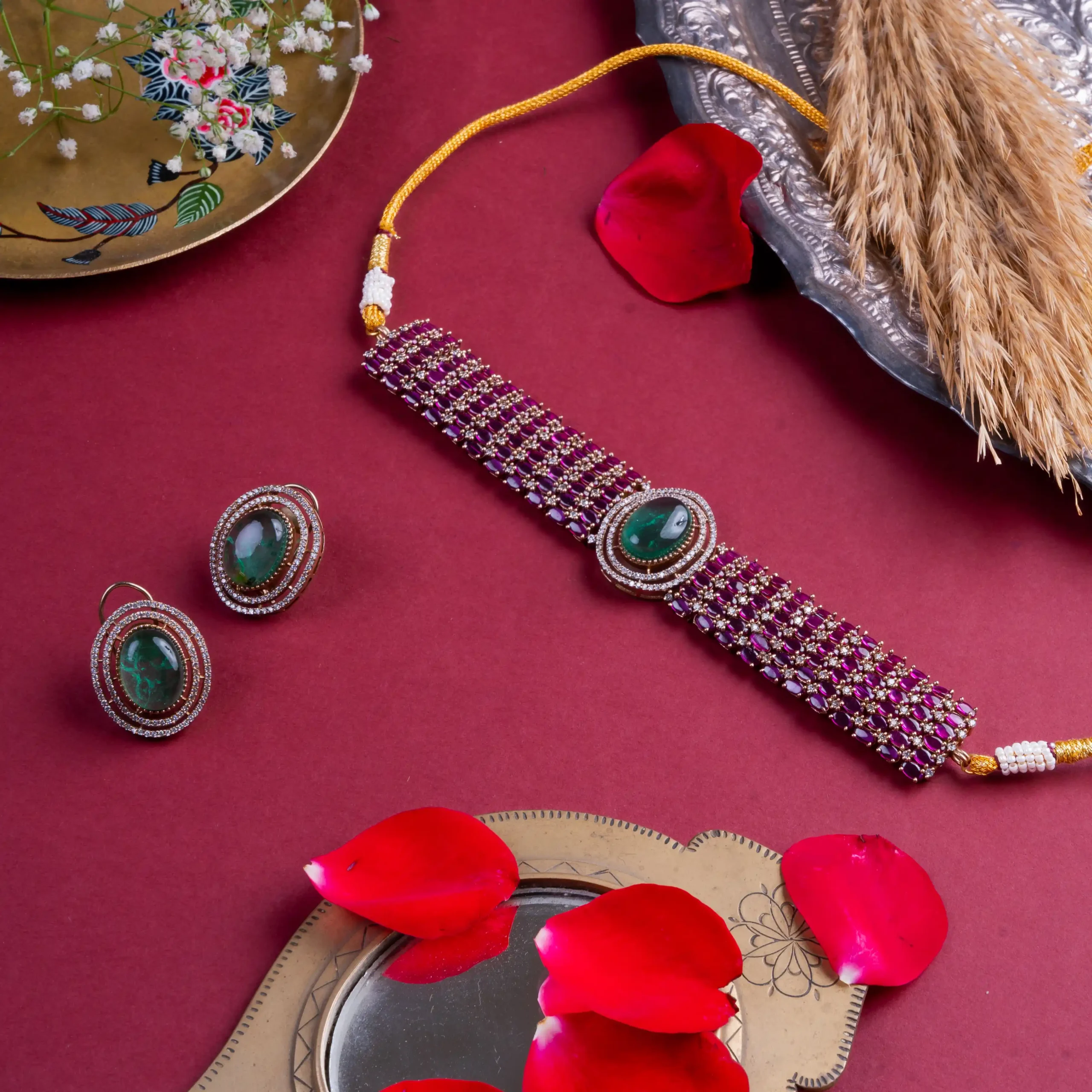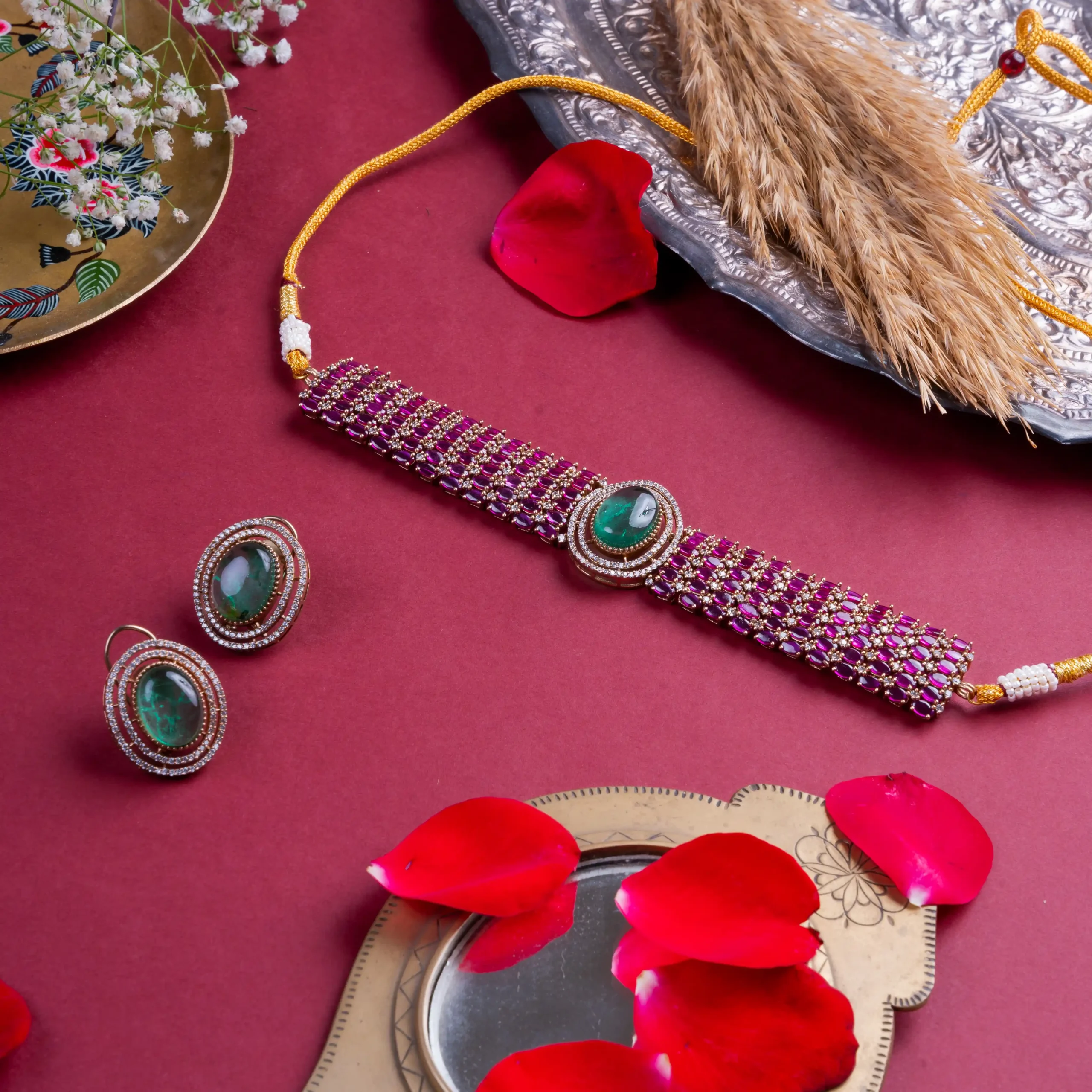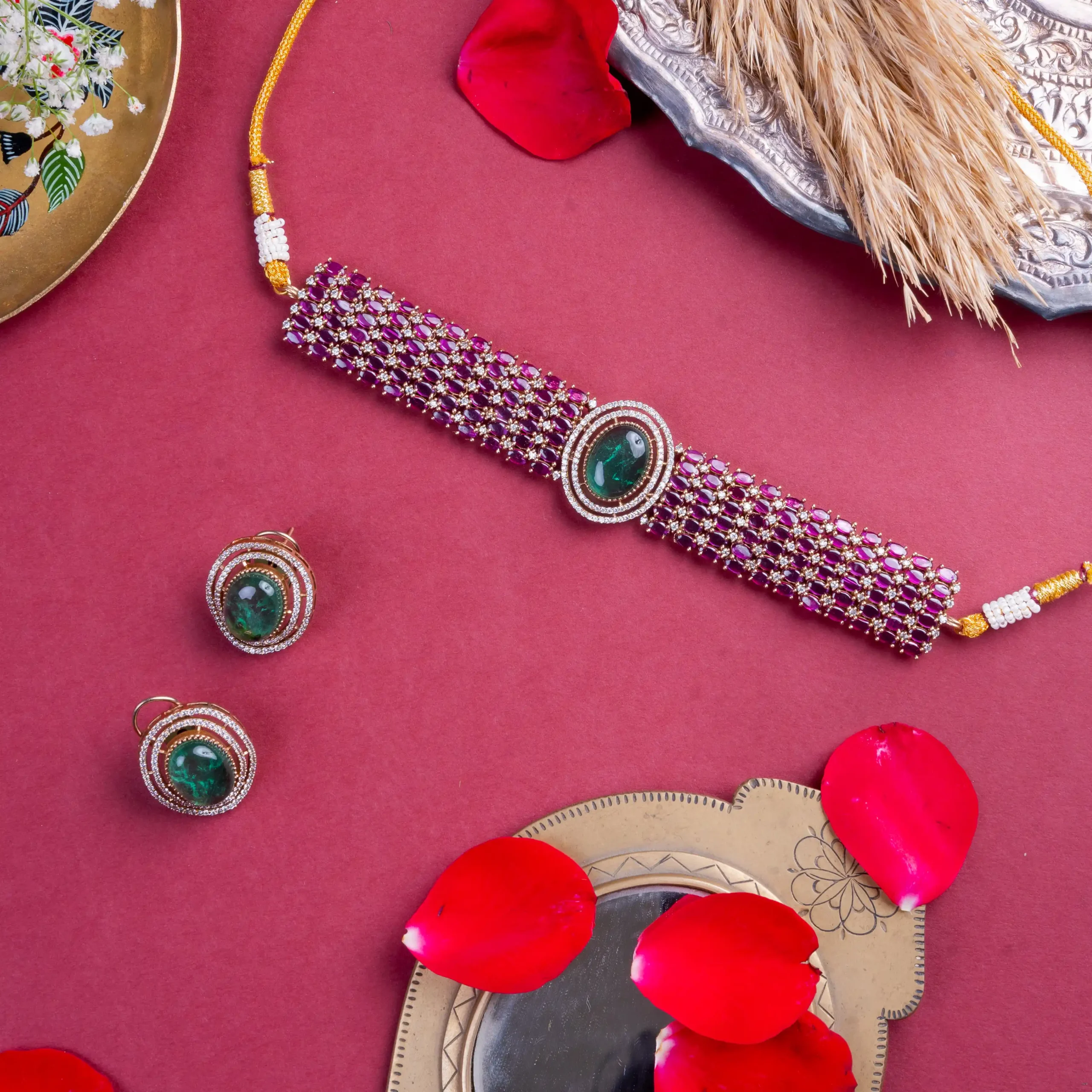 This ruby grid choker with a striking emerald centerpiece speaks volumes without saying a word.