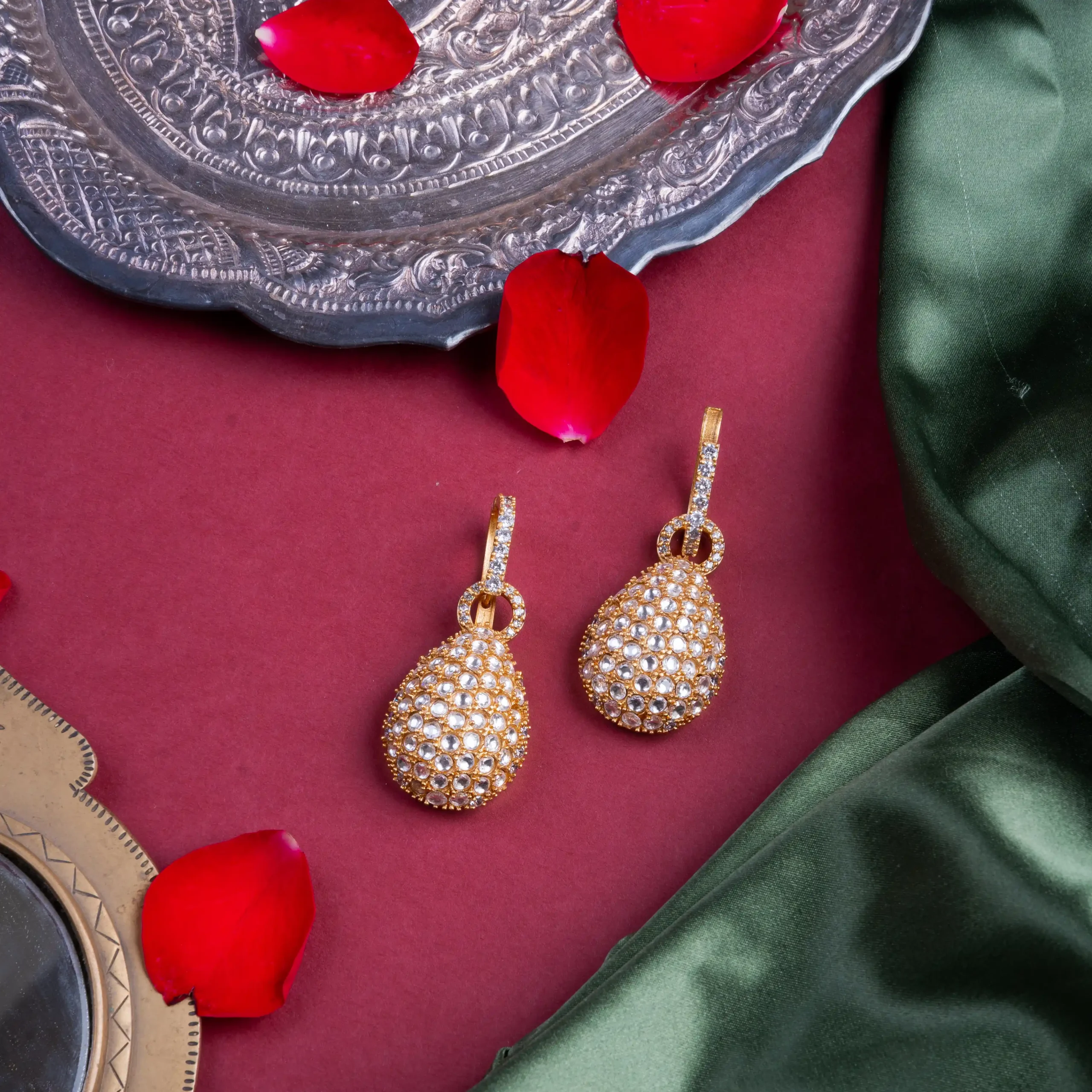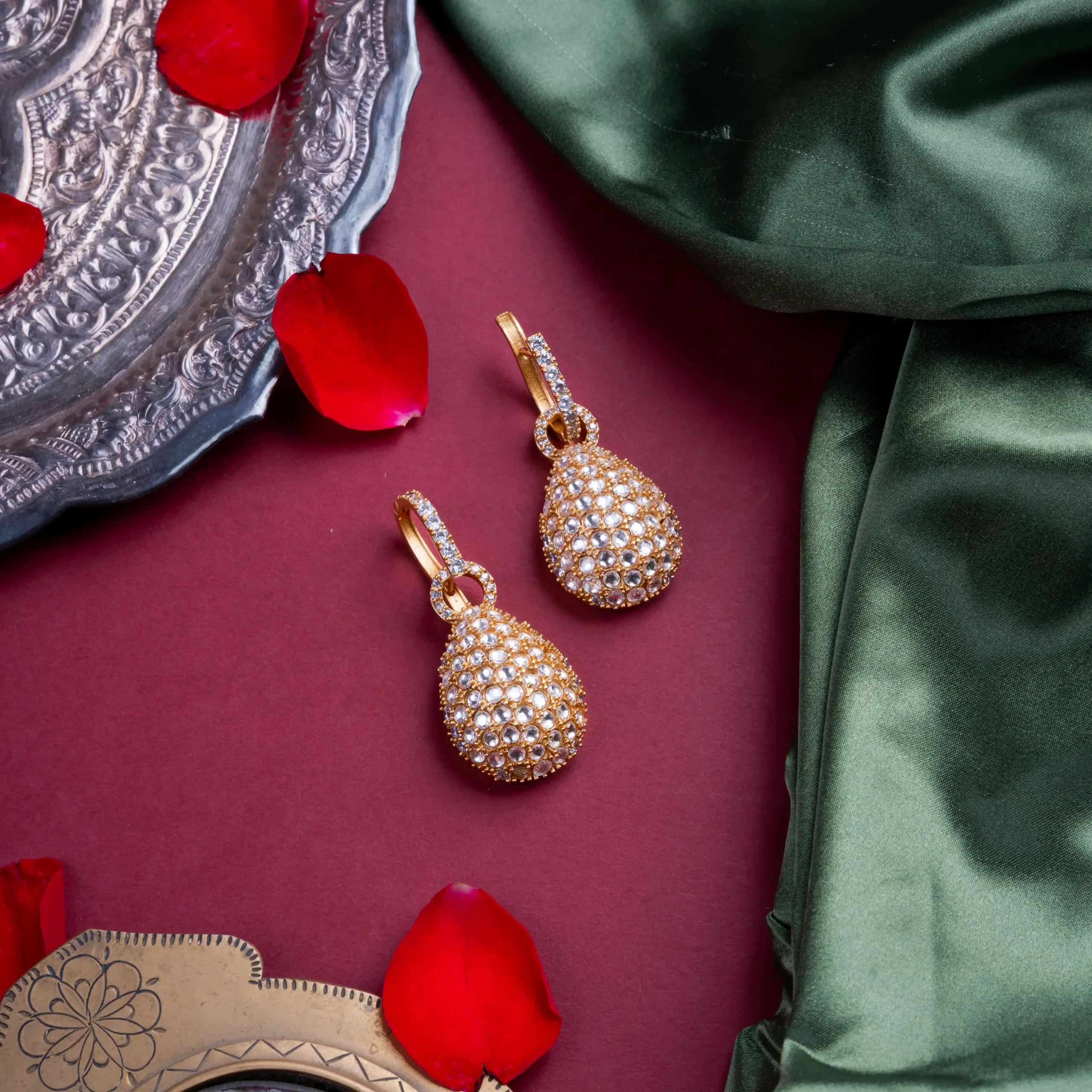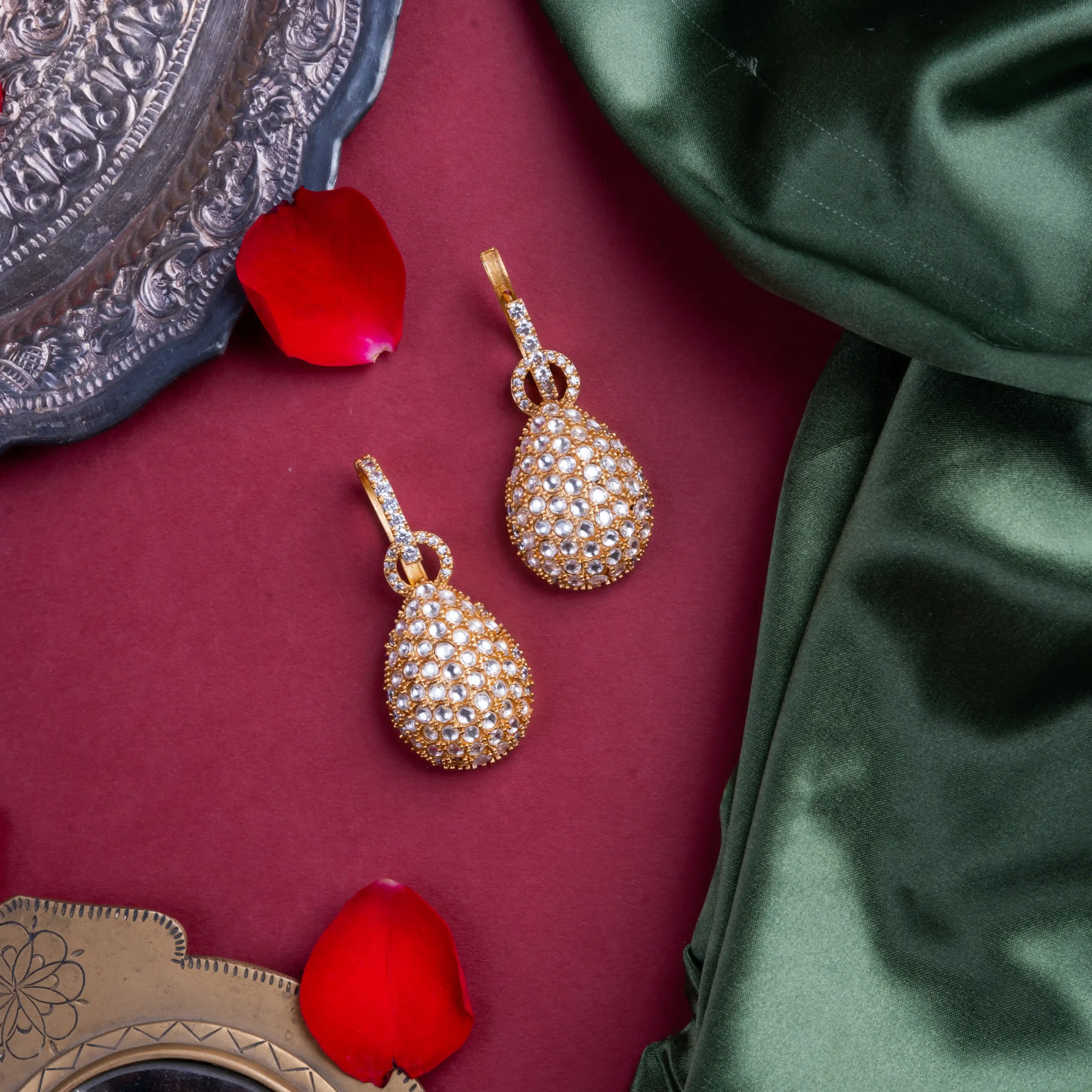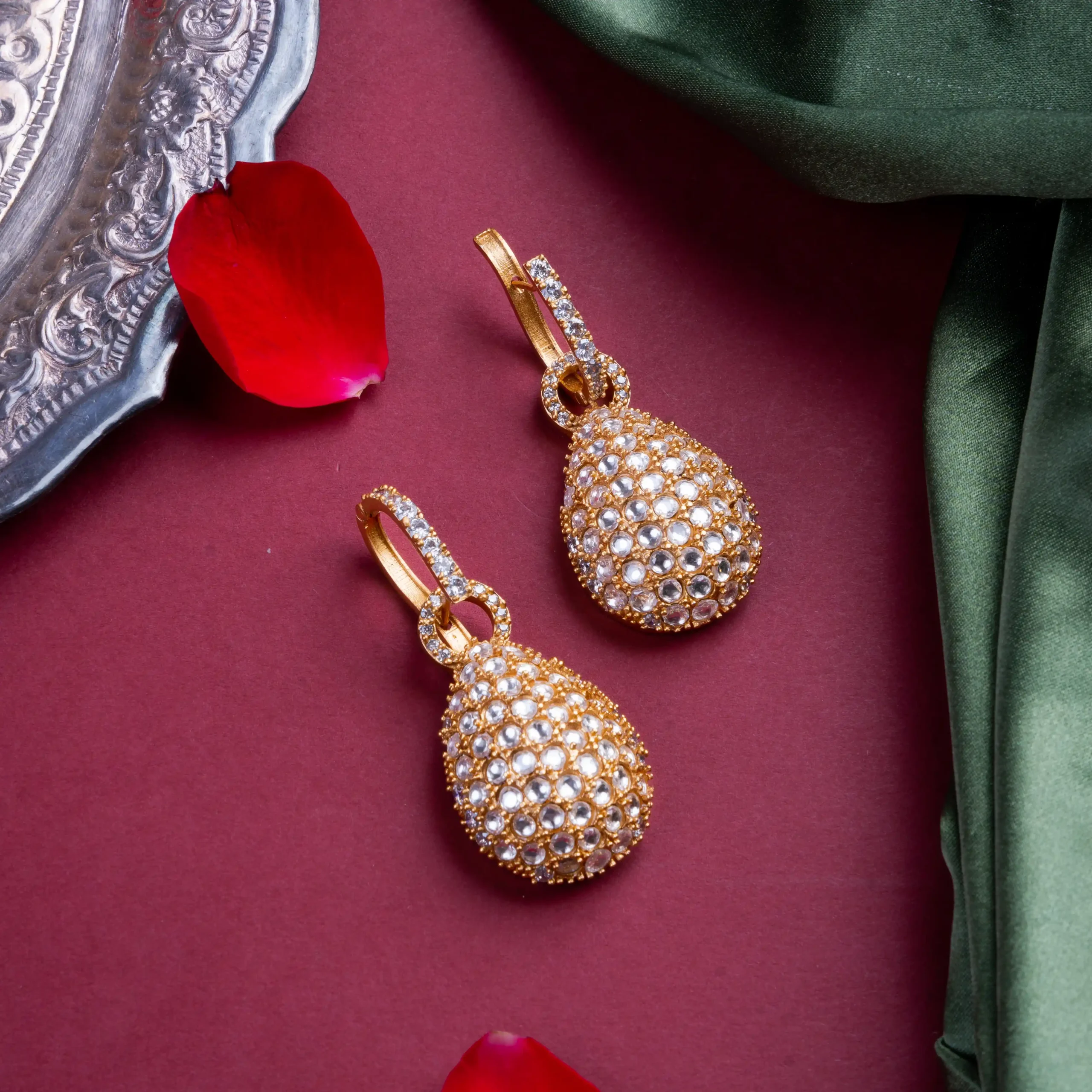 Designed with a dense pave setting of sparkling CZ stones in a luxe teardrop silhouette, these earrings are bold yet classy, perfect for glamour-led moods.