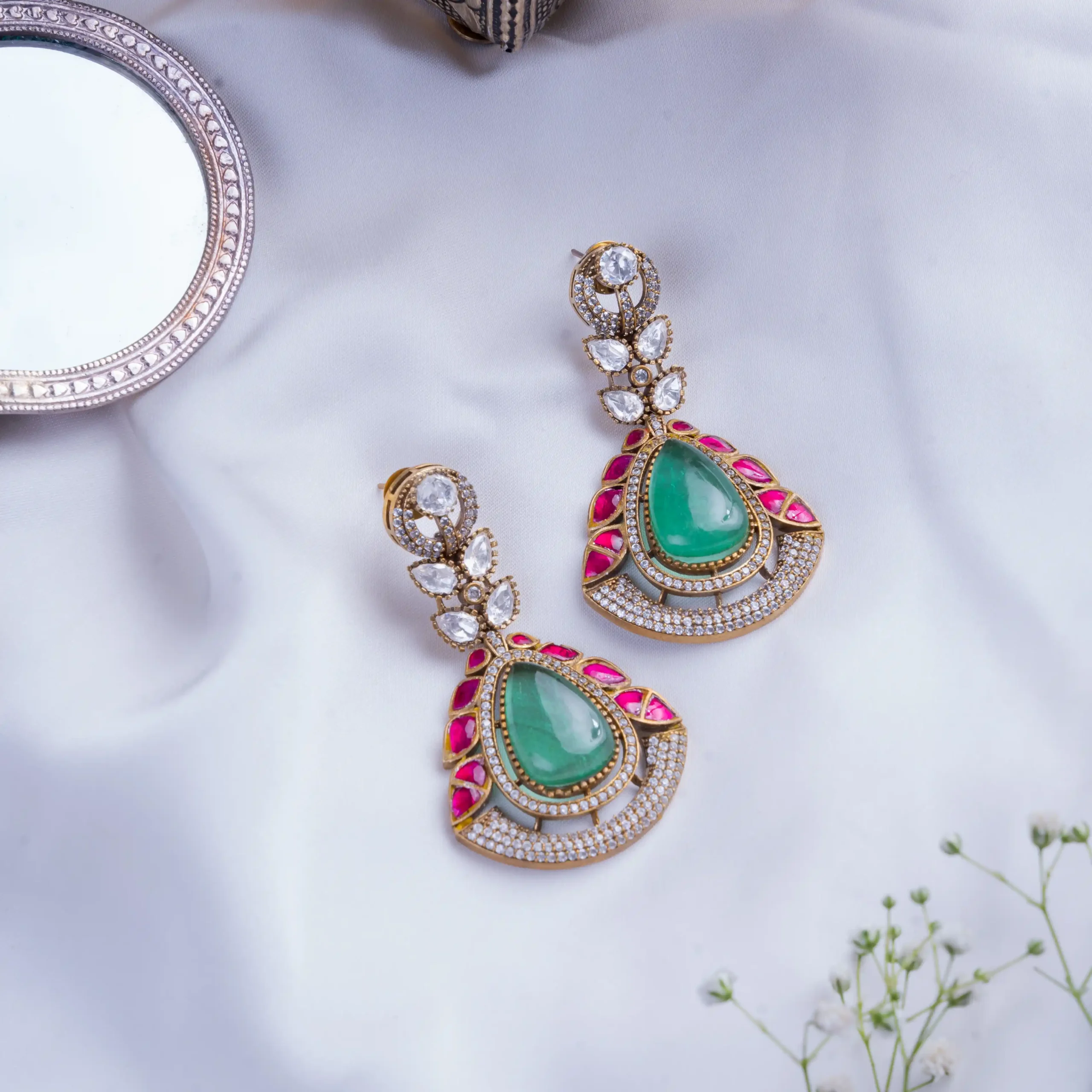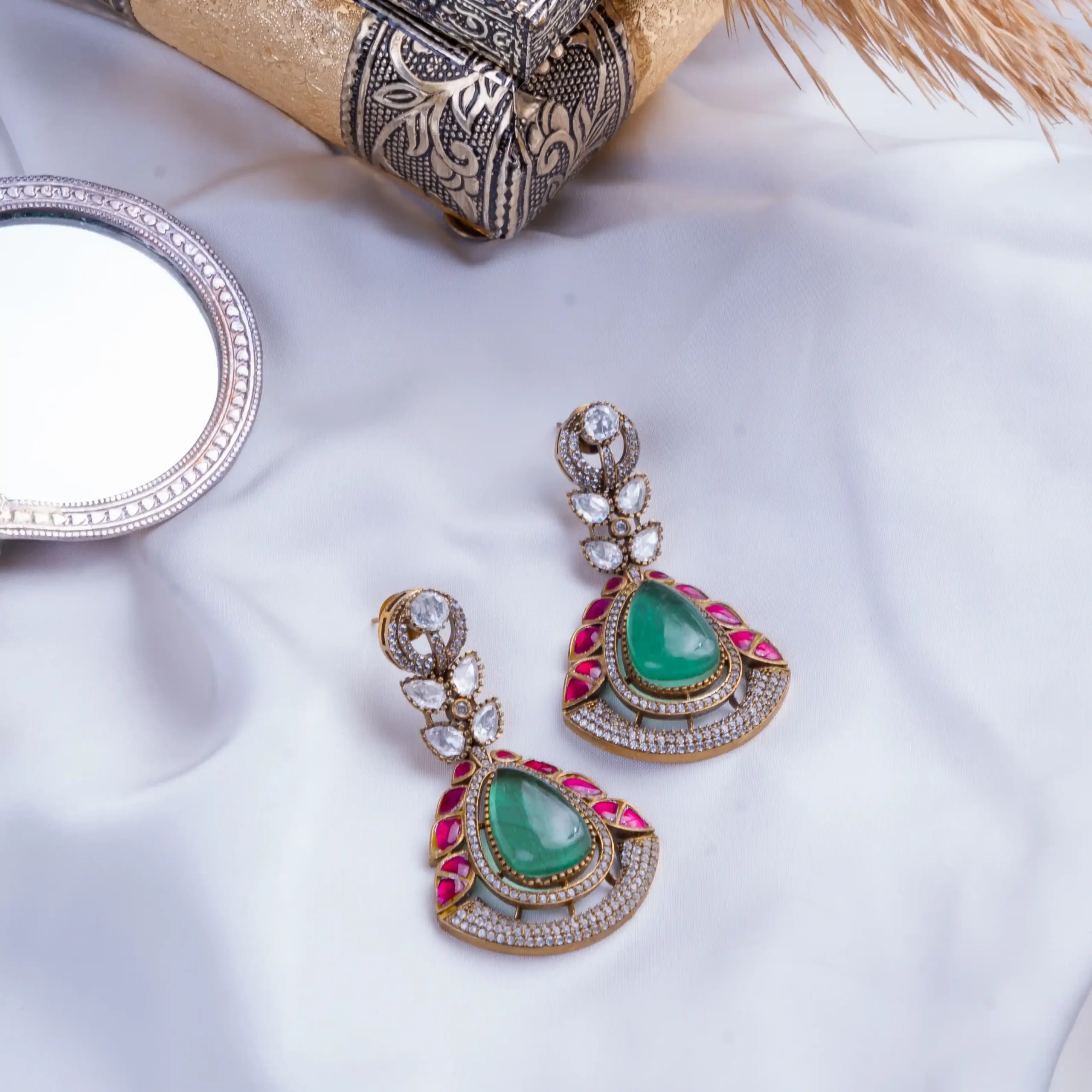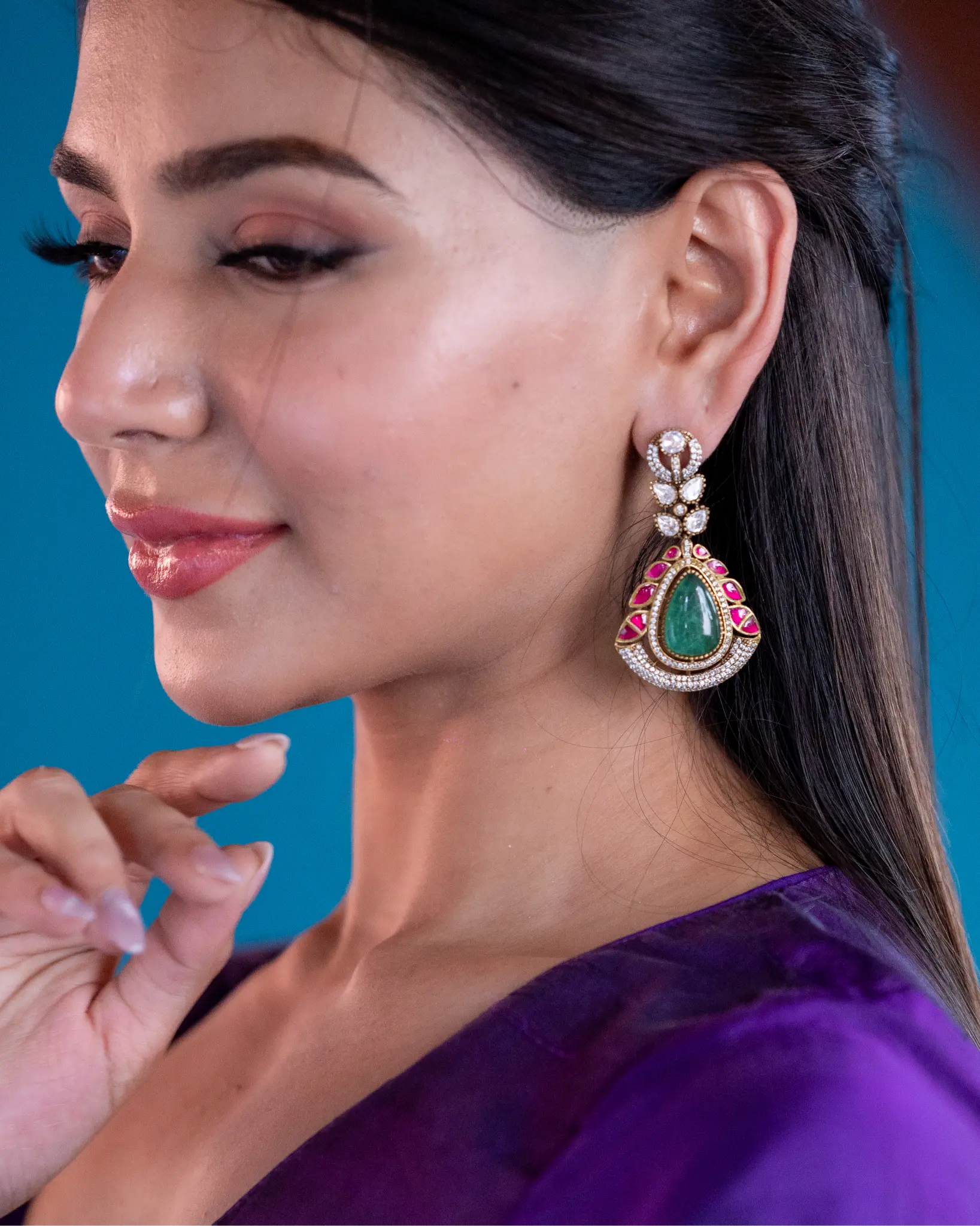 Unapologetically bold. These emerald drop earrings framed with ruby tones and crystals bring royal drama with a modern bite.