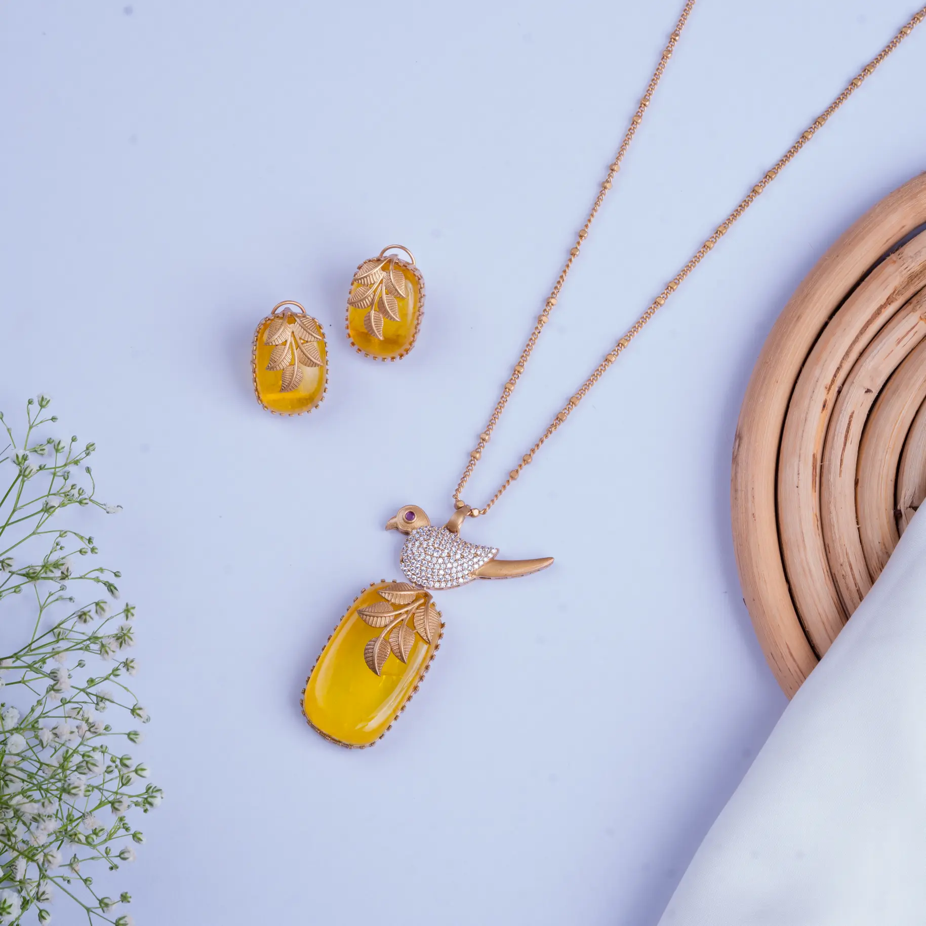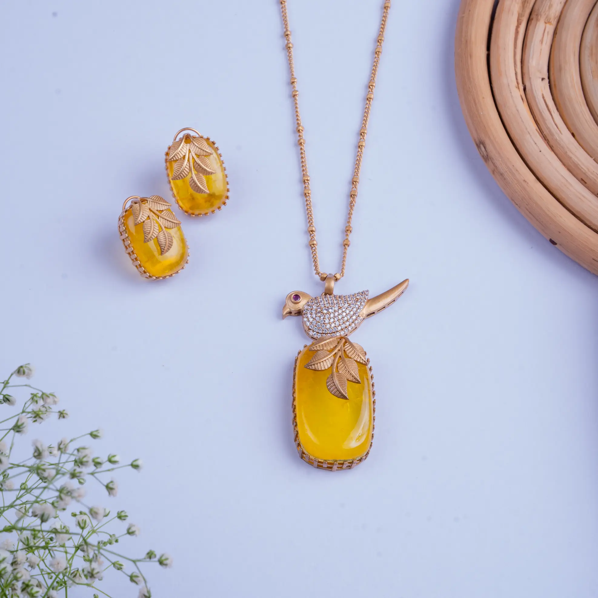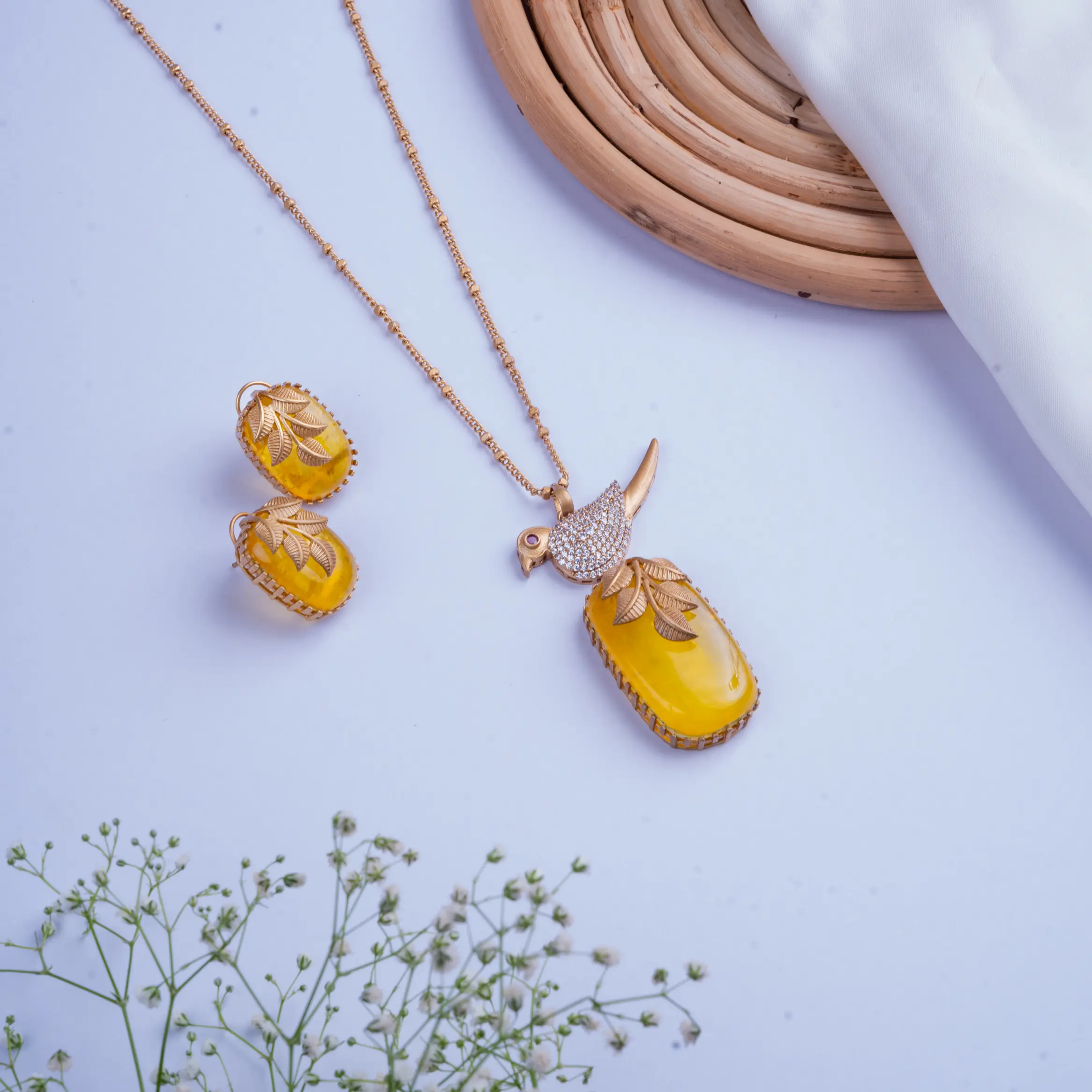 This pendant set captures the glow of dusk in sculpted leaves and honey-toned stones, perfect for understated glam.