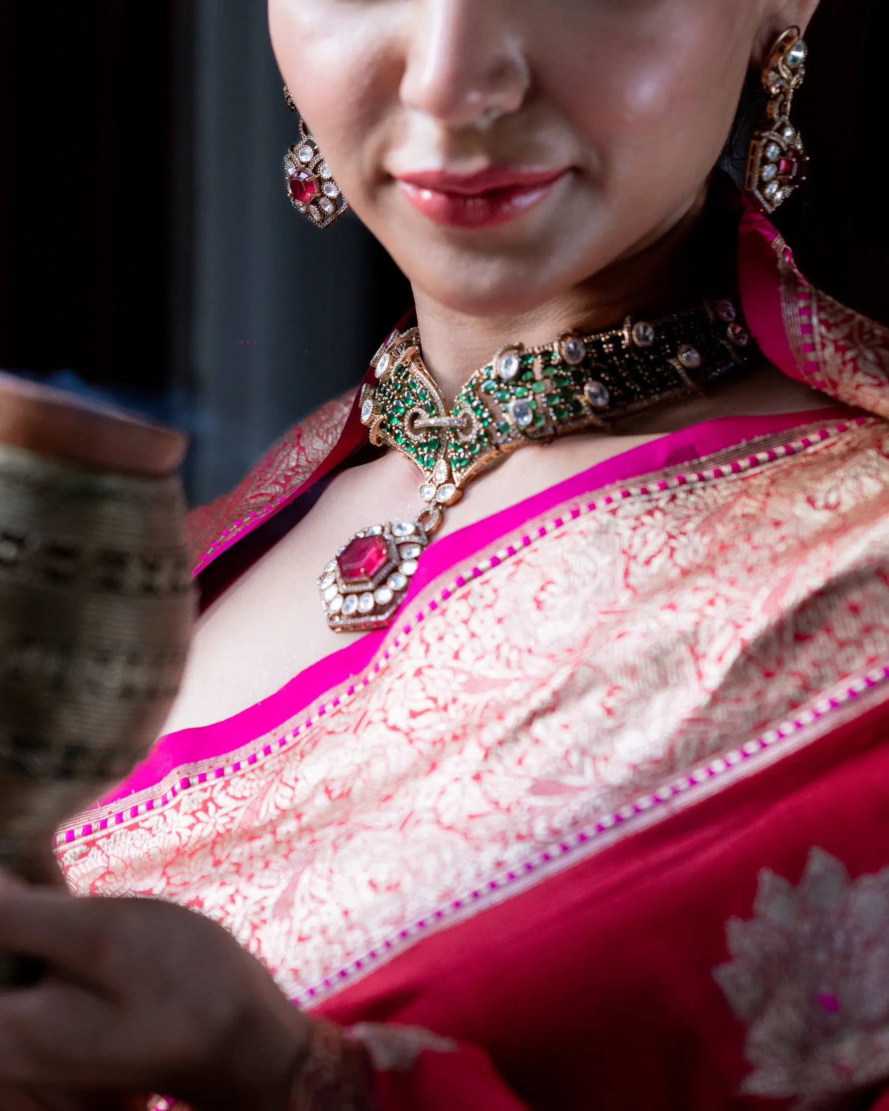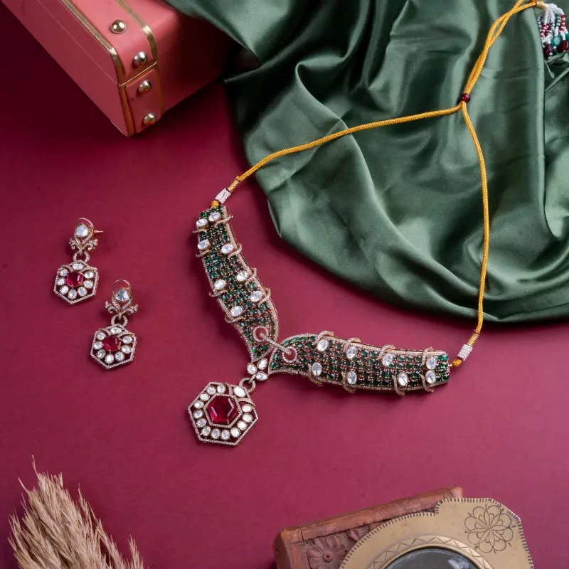 A fusion of geometry and grandeur — this emerald-studded choker with a ruby hexagon pendant redefines royal chic.