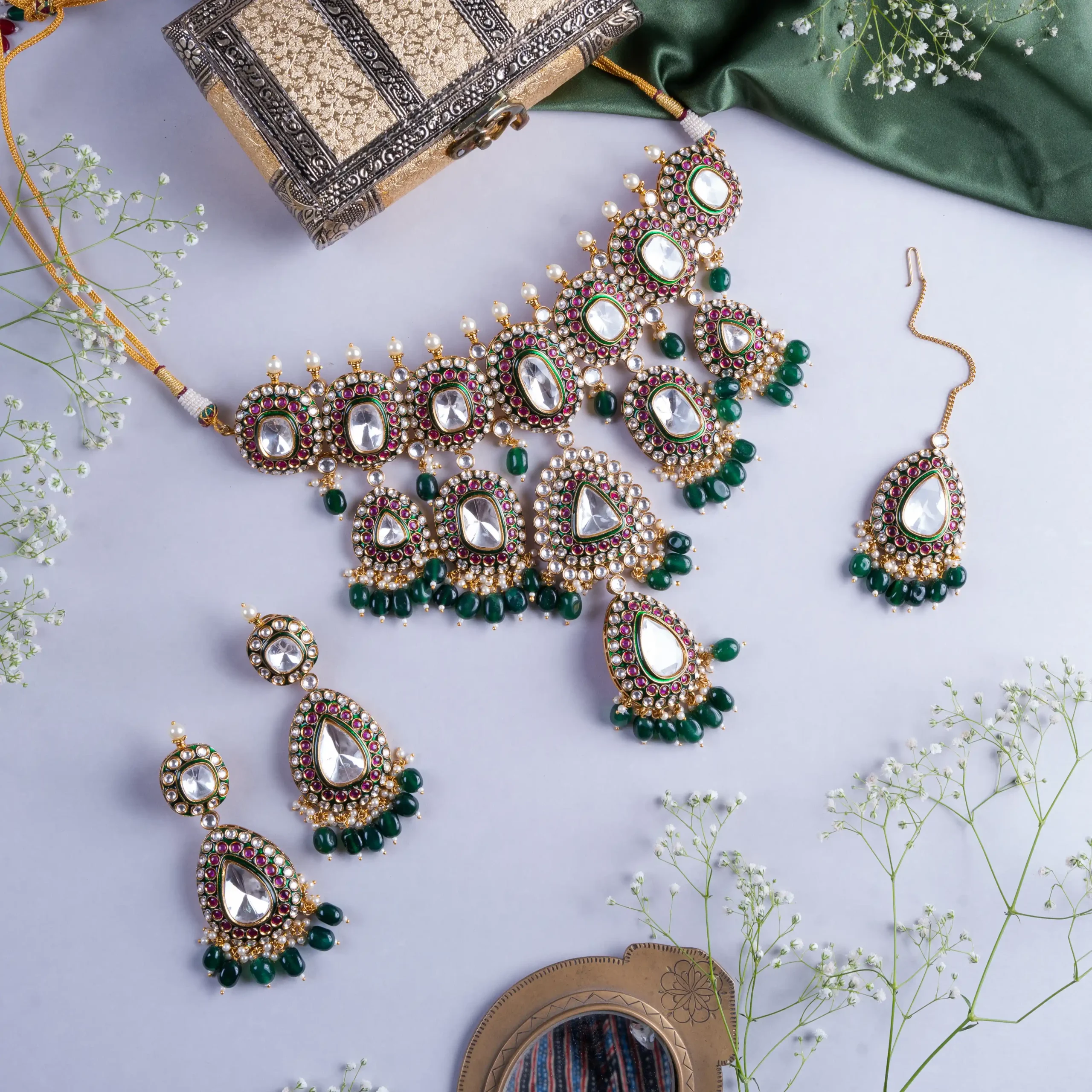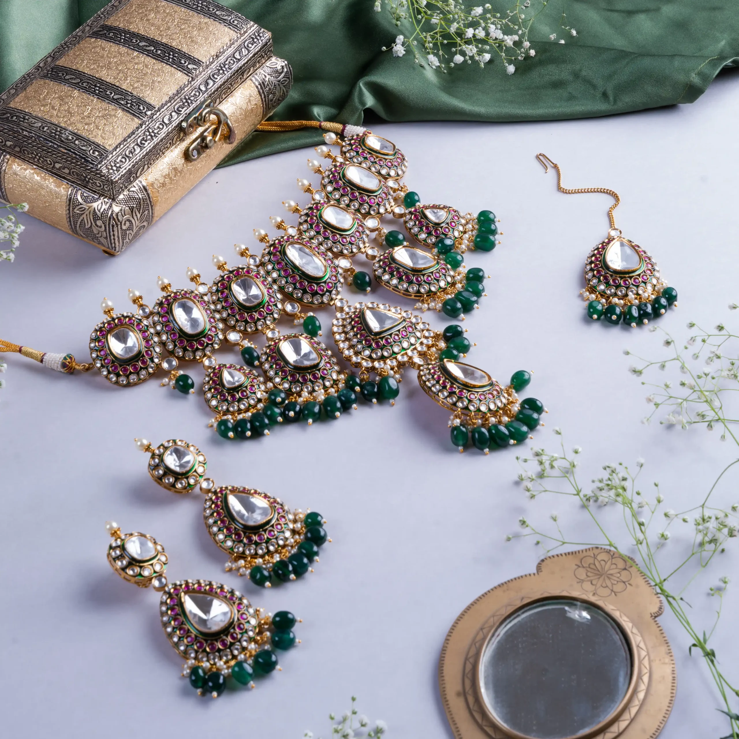 - Composition : Polki stones, Ruby accents, Green beads, CZ stones, Gold-plated alloy