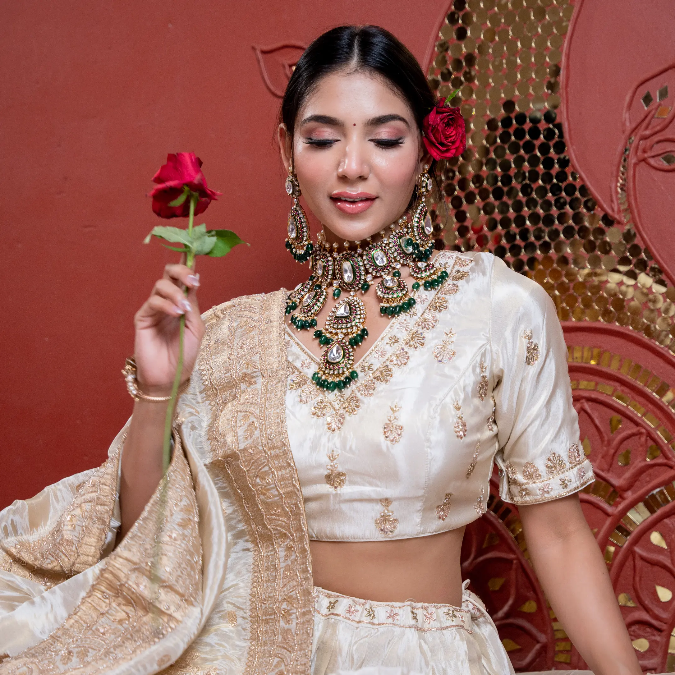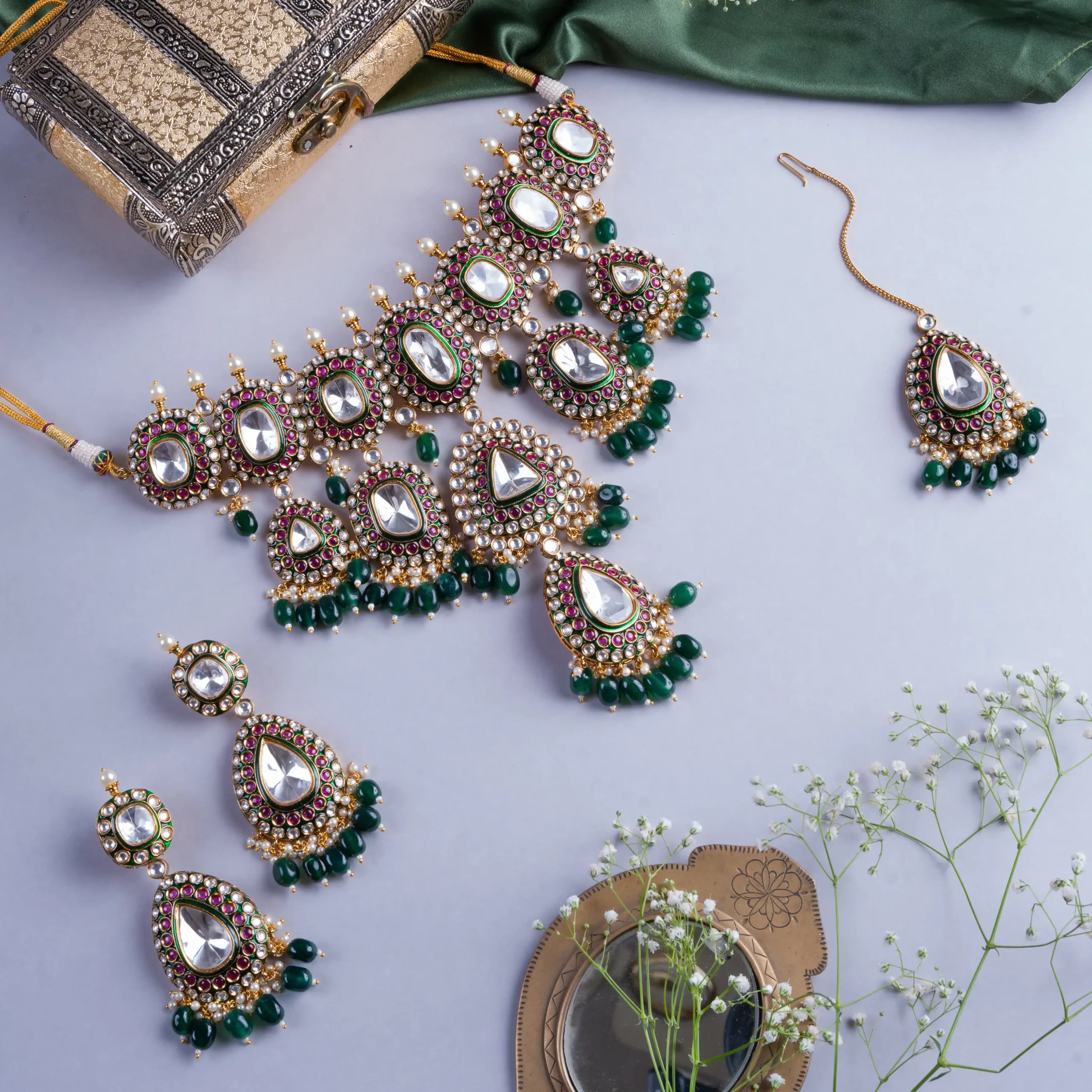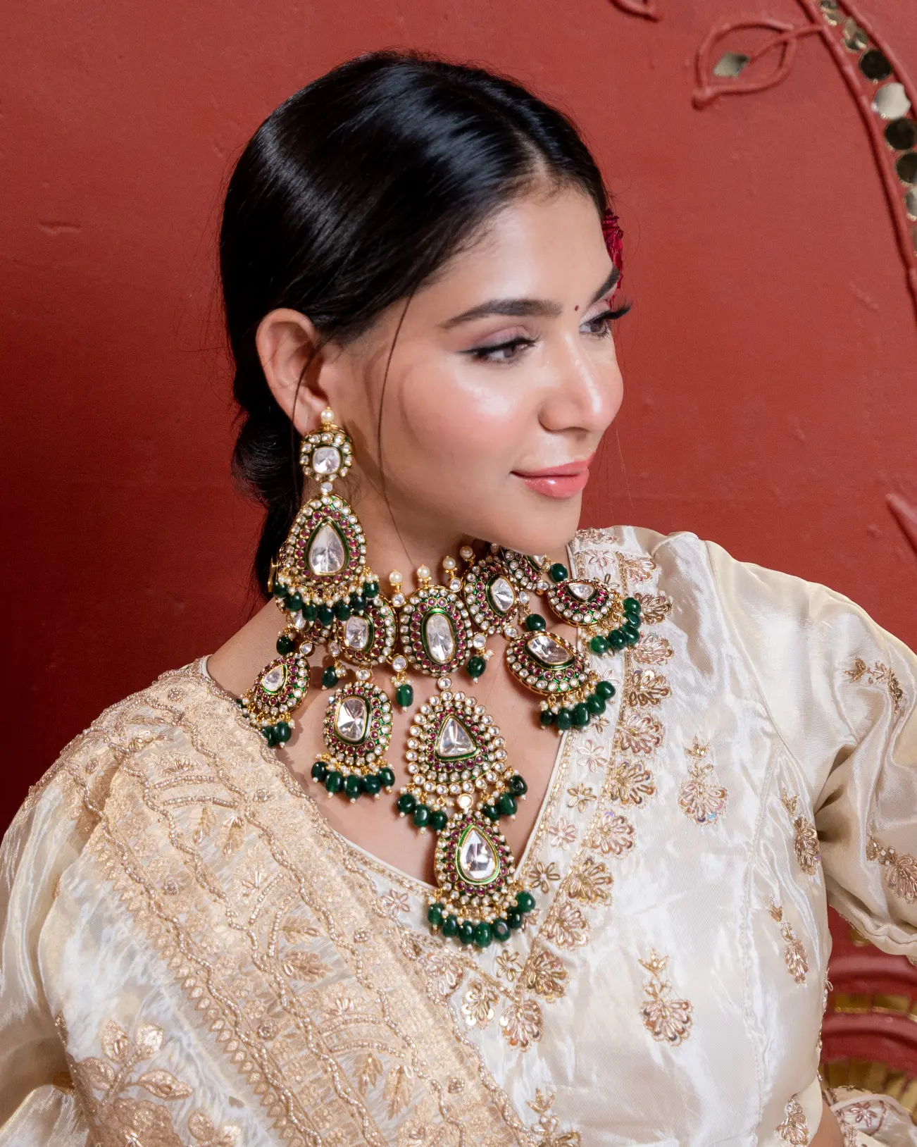 A masterpiece of traditional grandeur, this set is crafted with luxurious polki stones, ruby accents and deep green beads. The layered temple-inspired drops bring full royal drama, making this piece worthy of queens, not crowds.