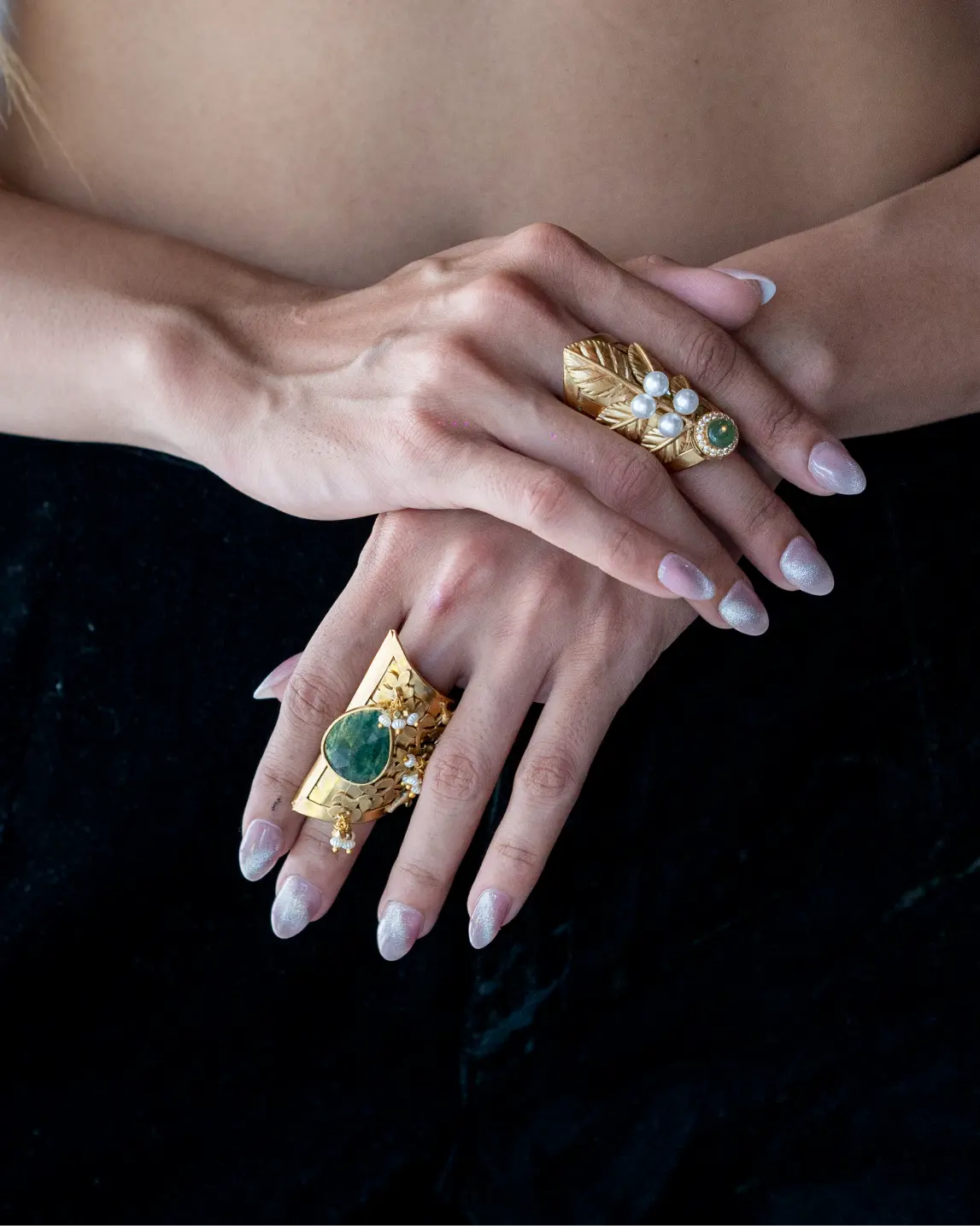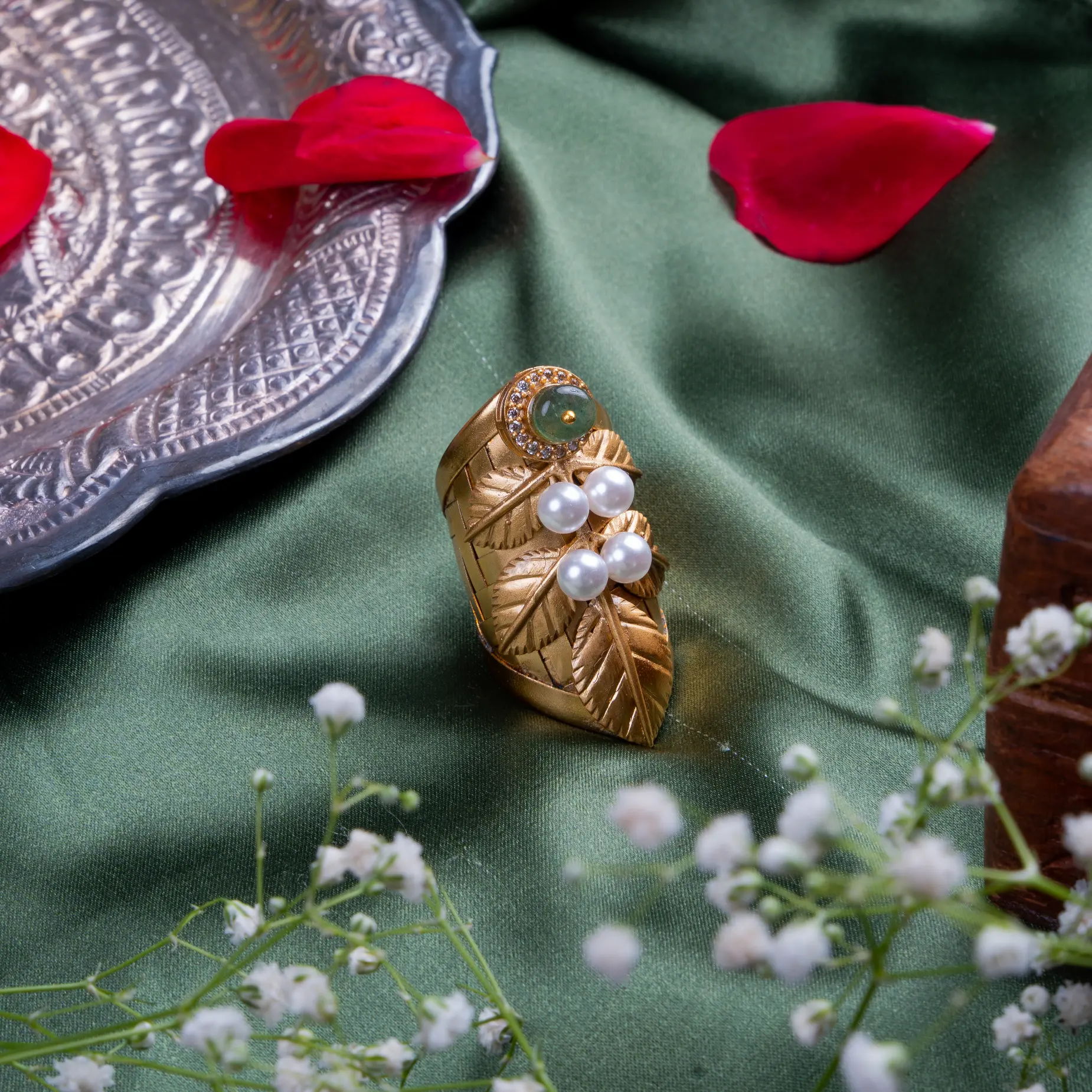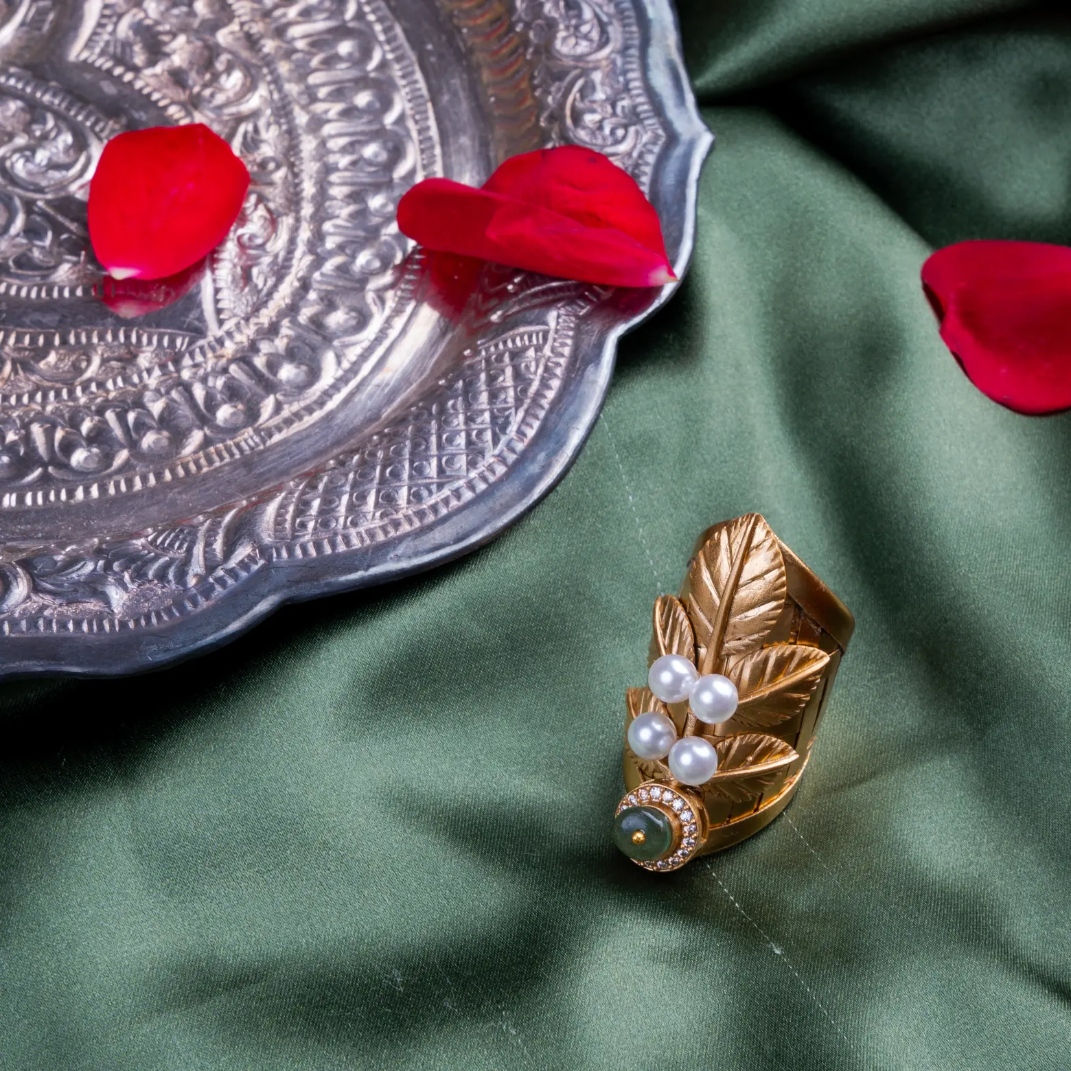 A vintage-inspired adjustable ring with antique gold leaf motifs, soft pearl accents and a touch of emerald enamel detail. Graceful, earthy and timeless.