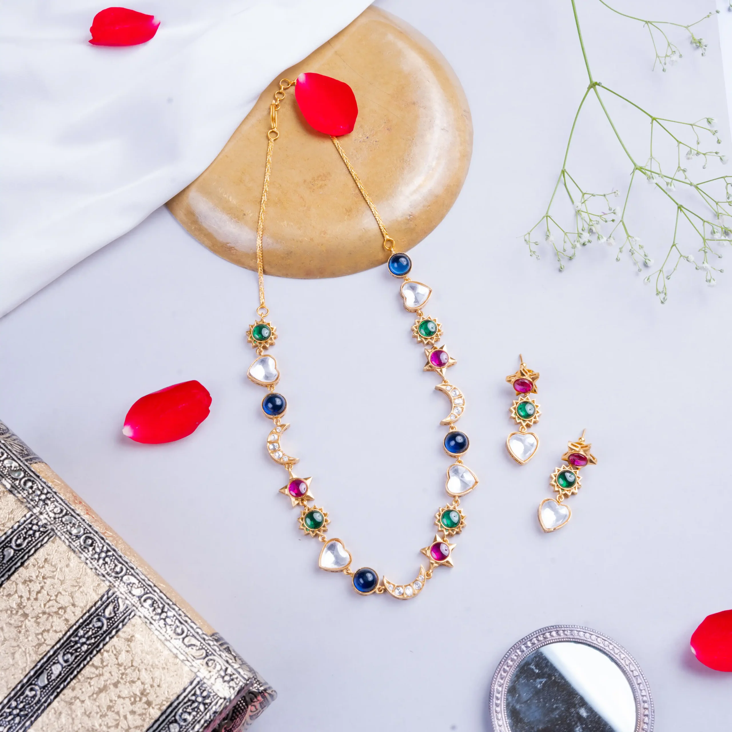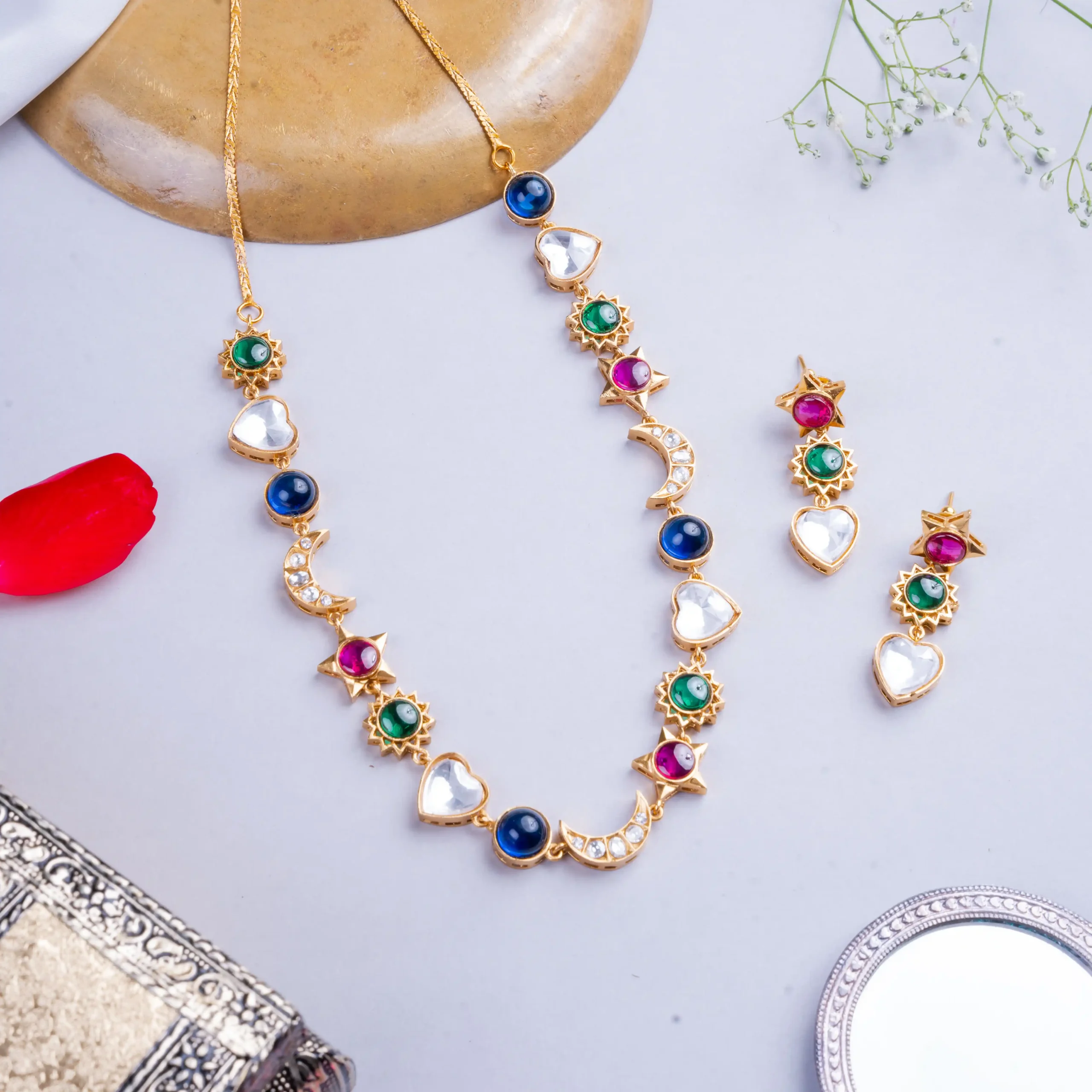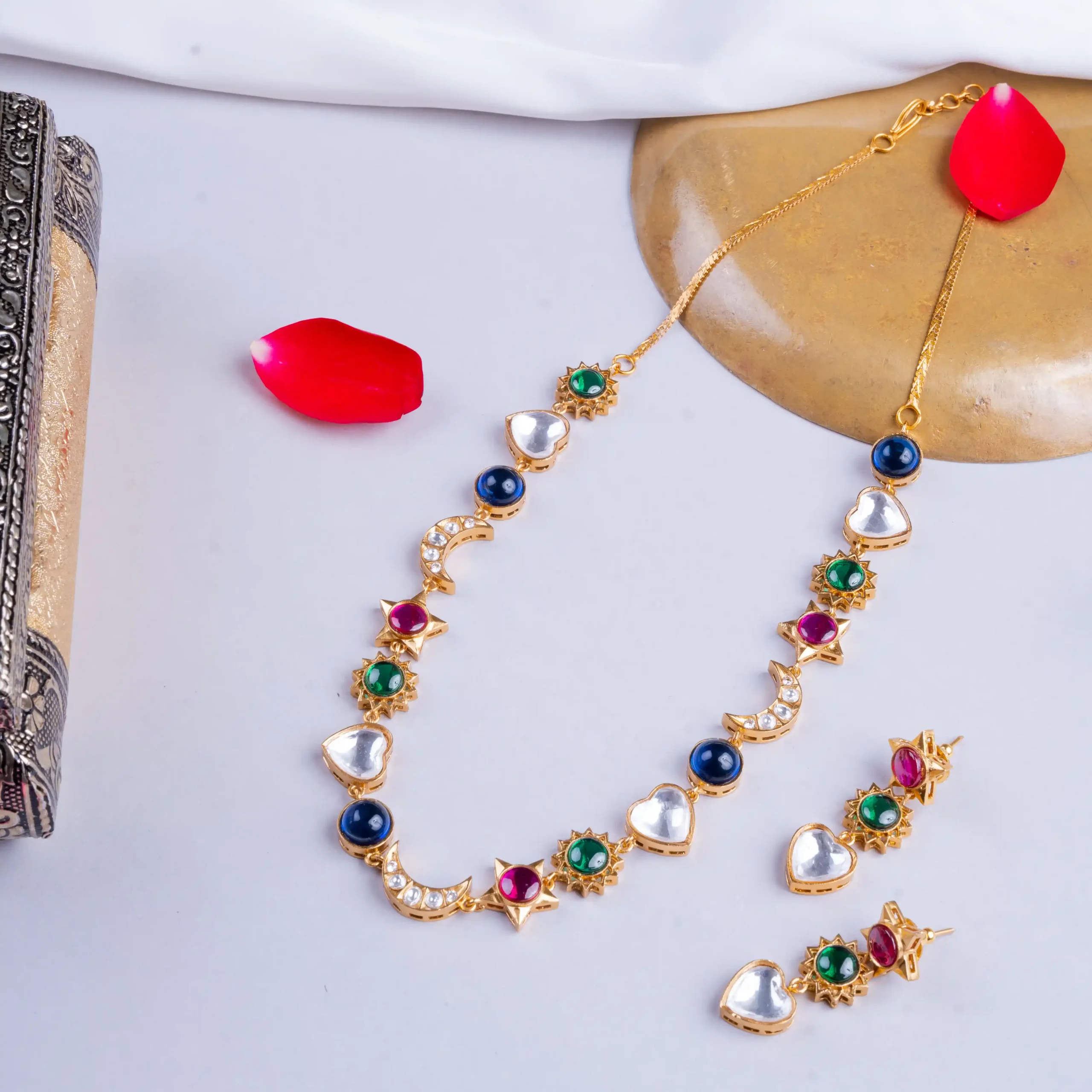 Cosmic glam meets royal energy. This celestial charm necklace brings moons, stars and power stones together—designed for women who rule their own universe.
