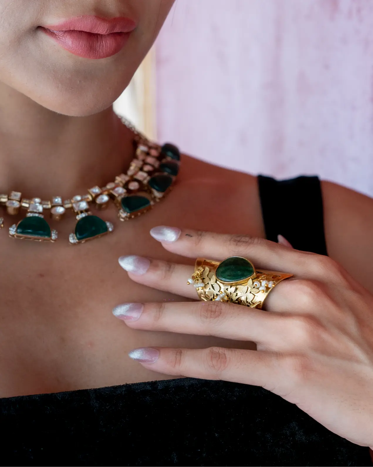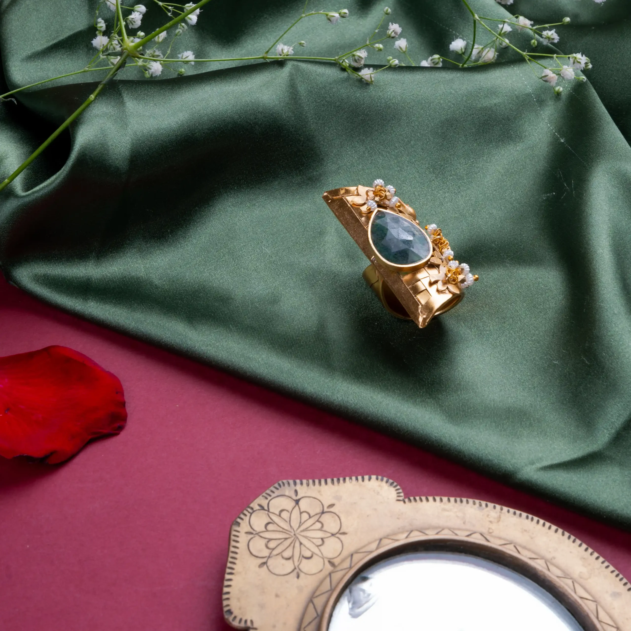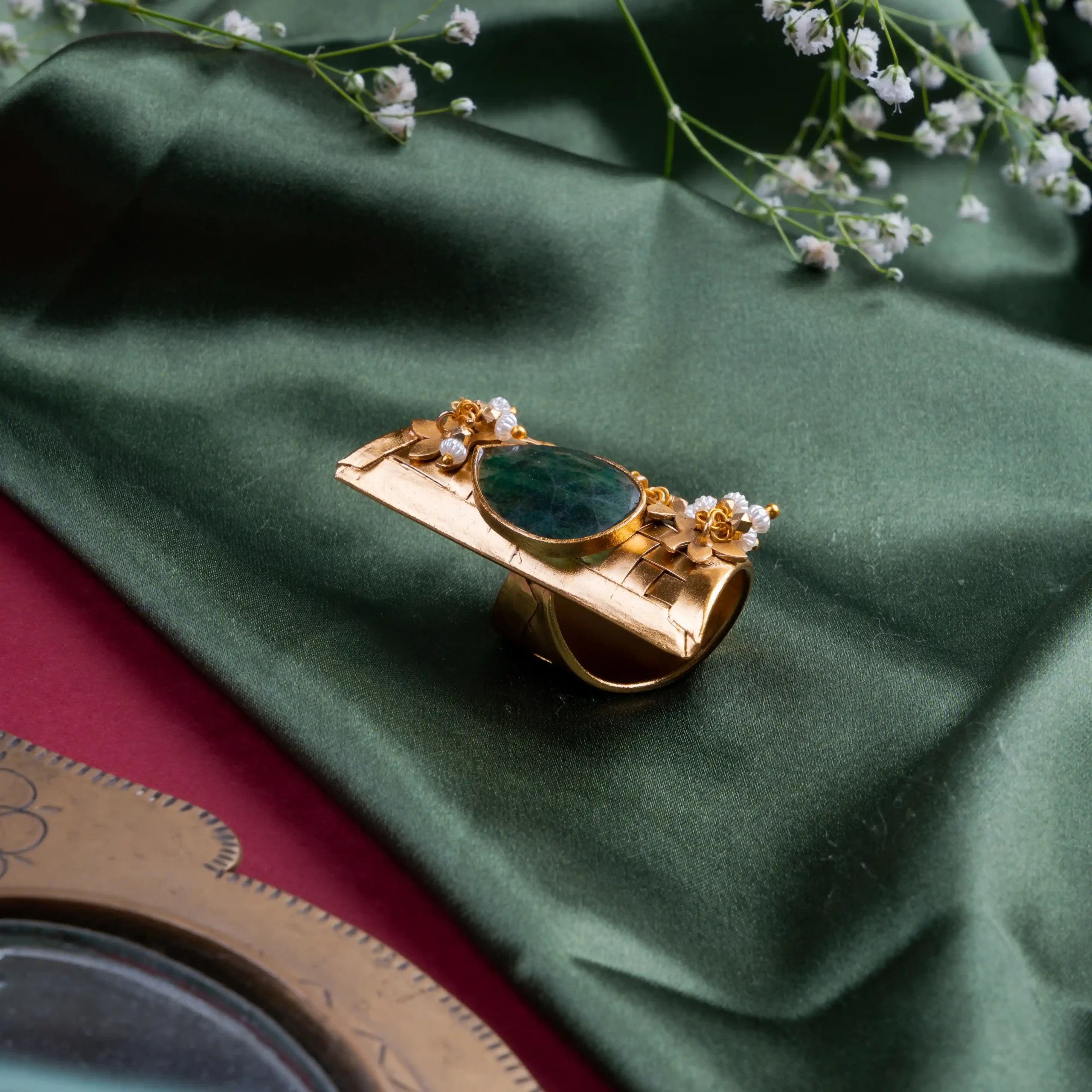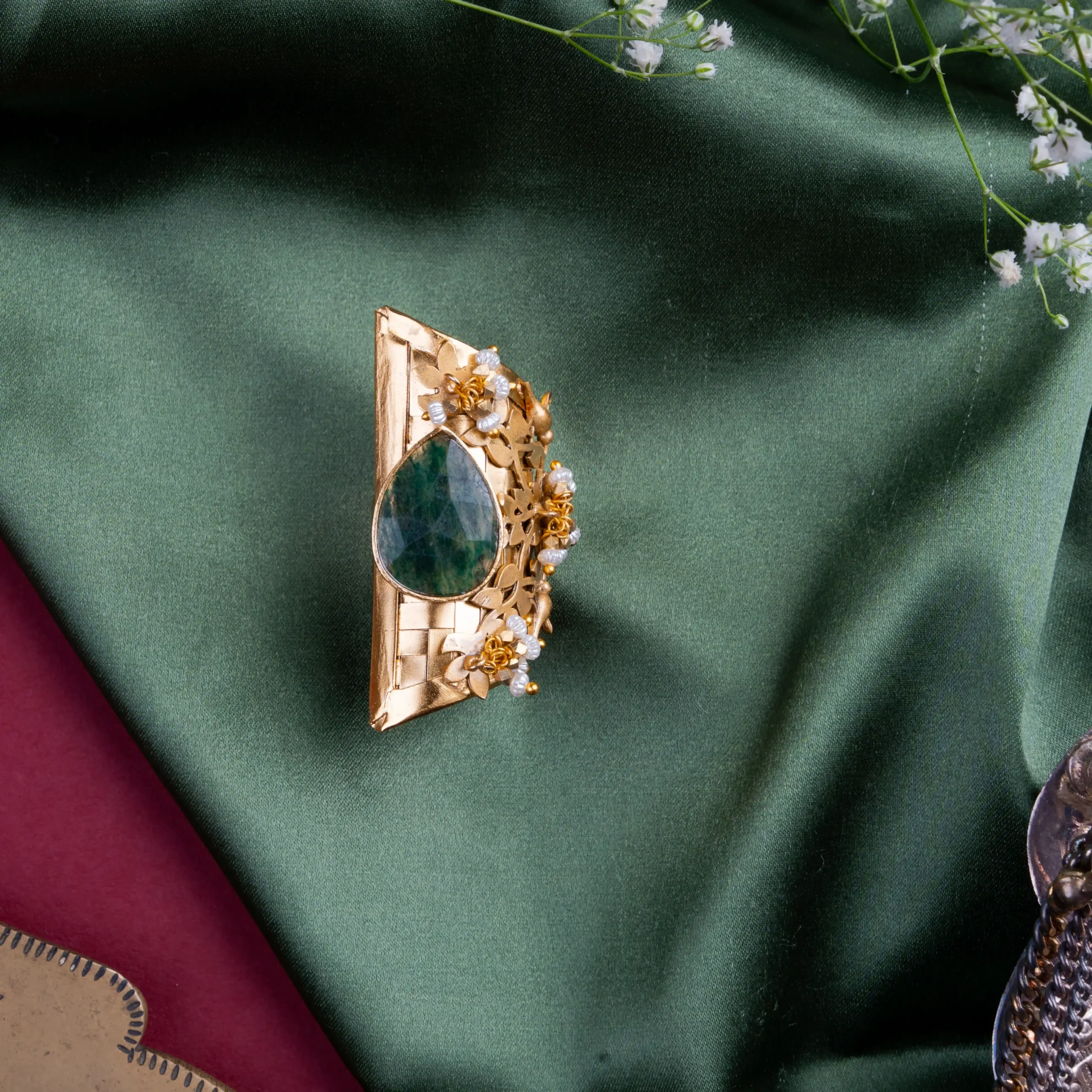 A bold emerald tear-drop centerpiece surrounded by intricate floral metalwork and pearl drops.