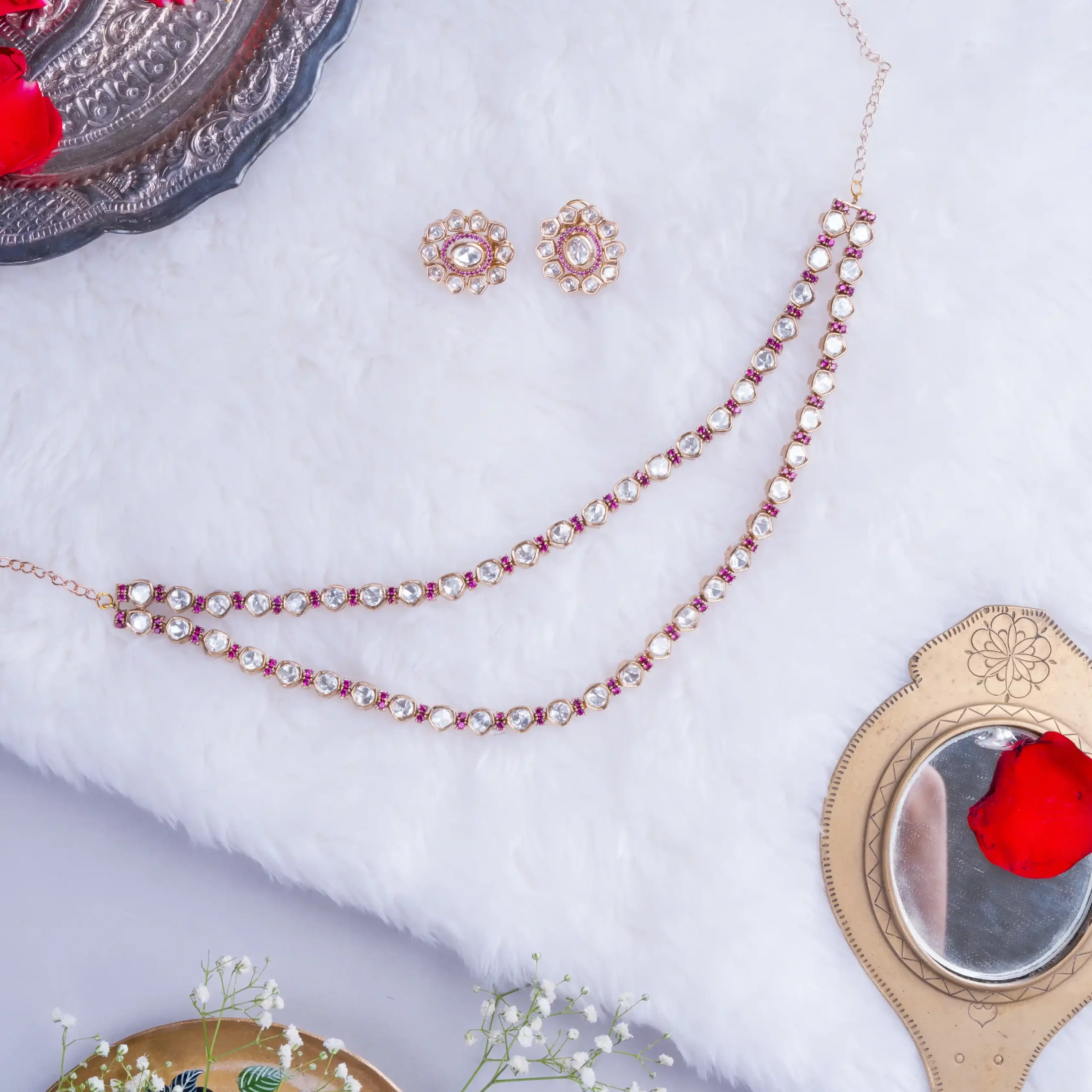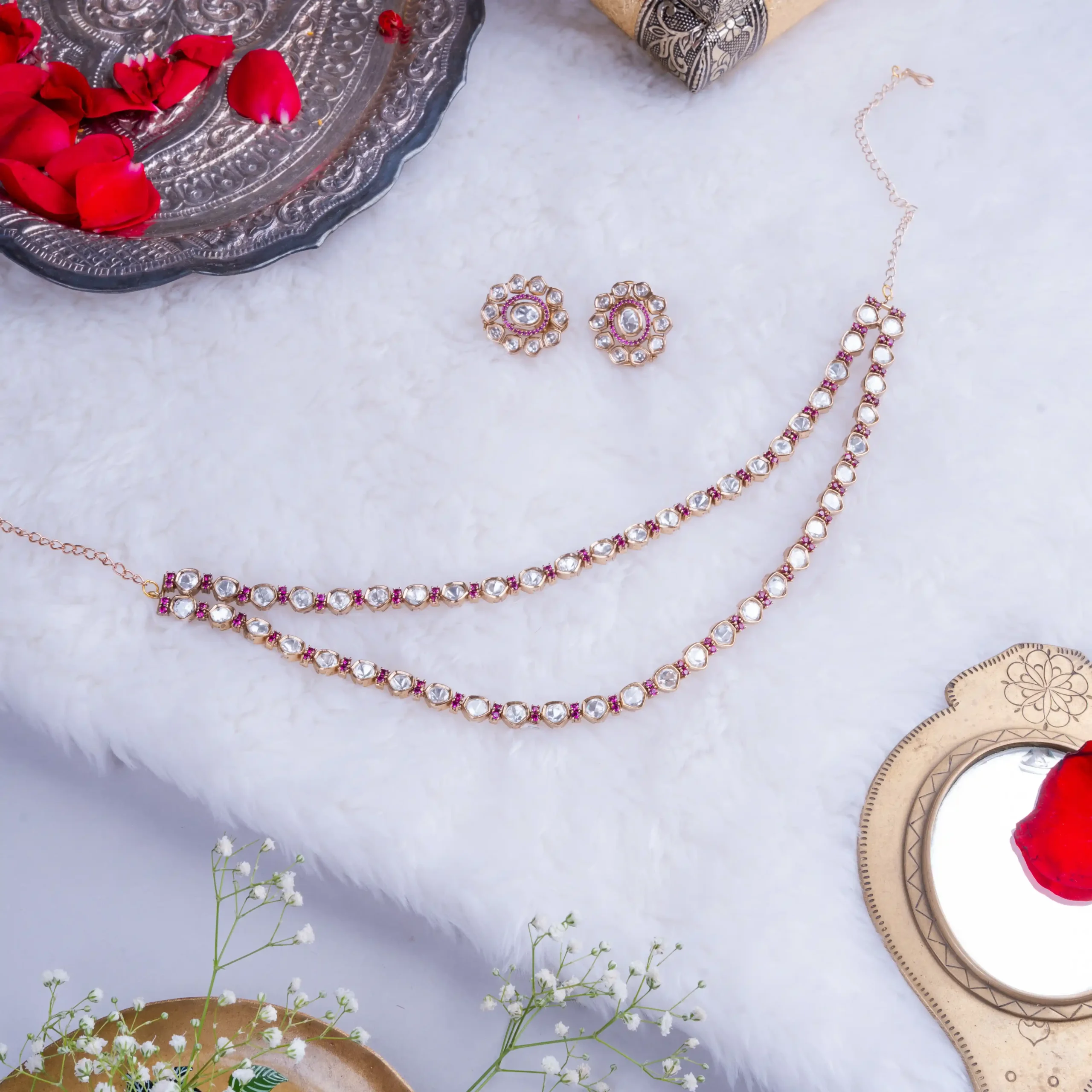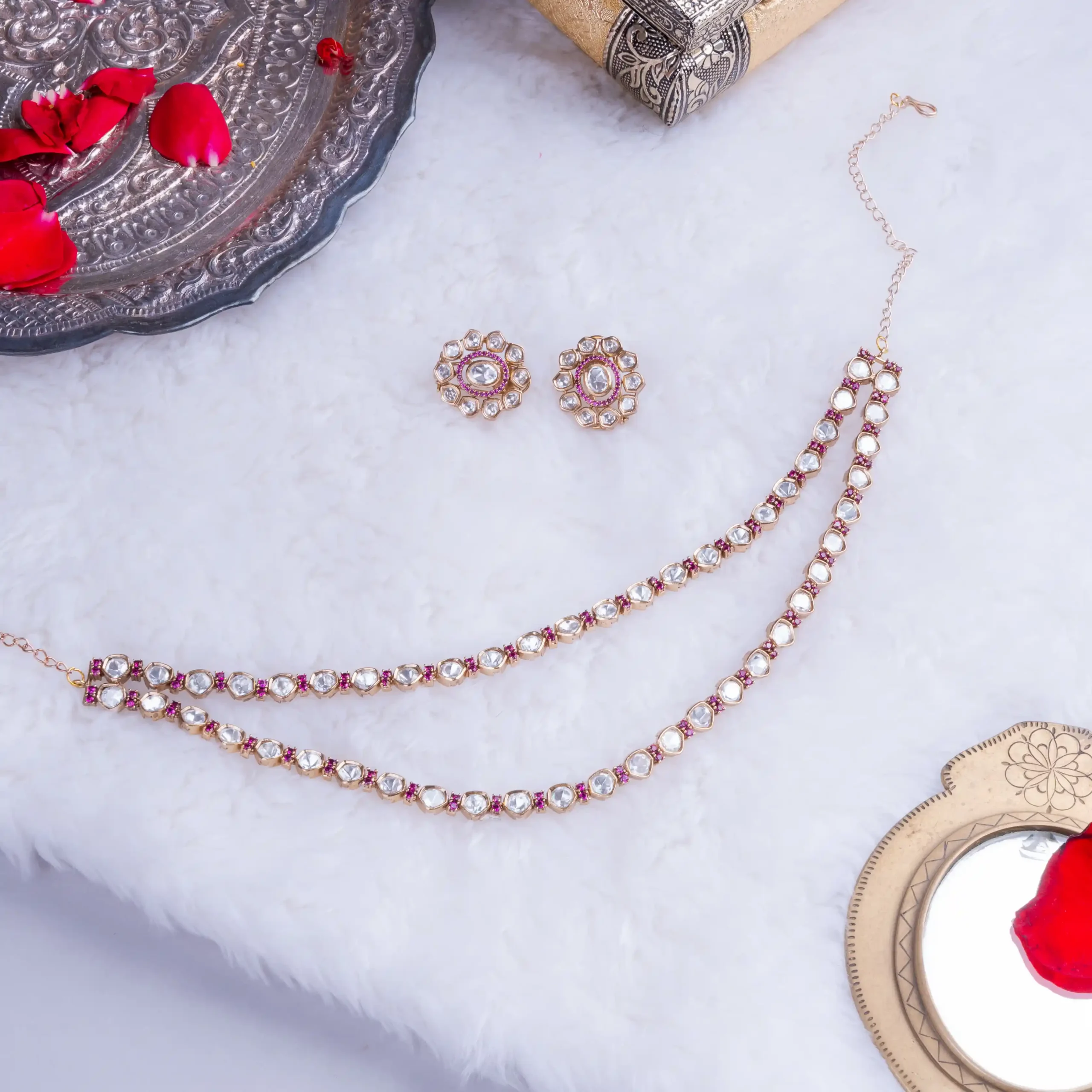 - Composition : Kundan stones, Ruby accents, Gold-plated alloy