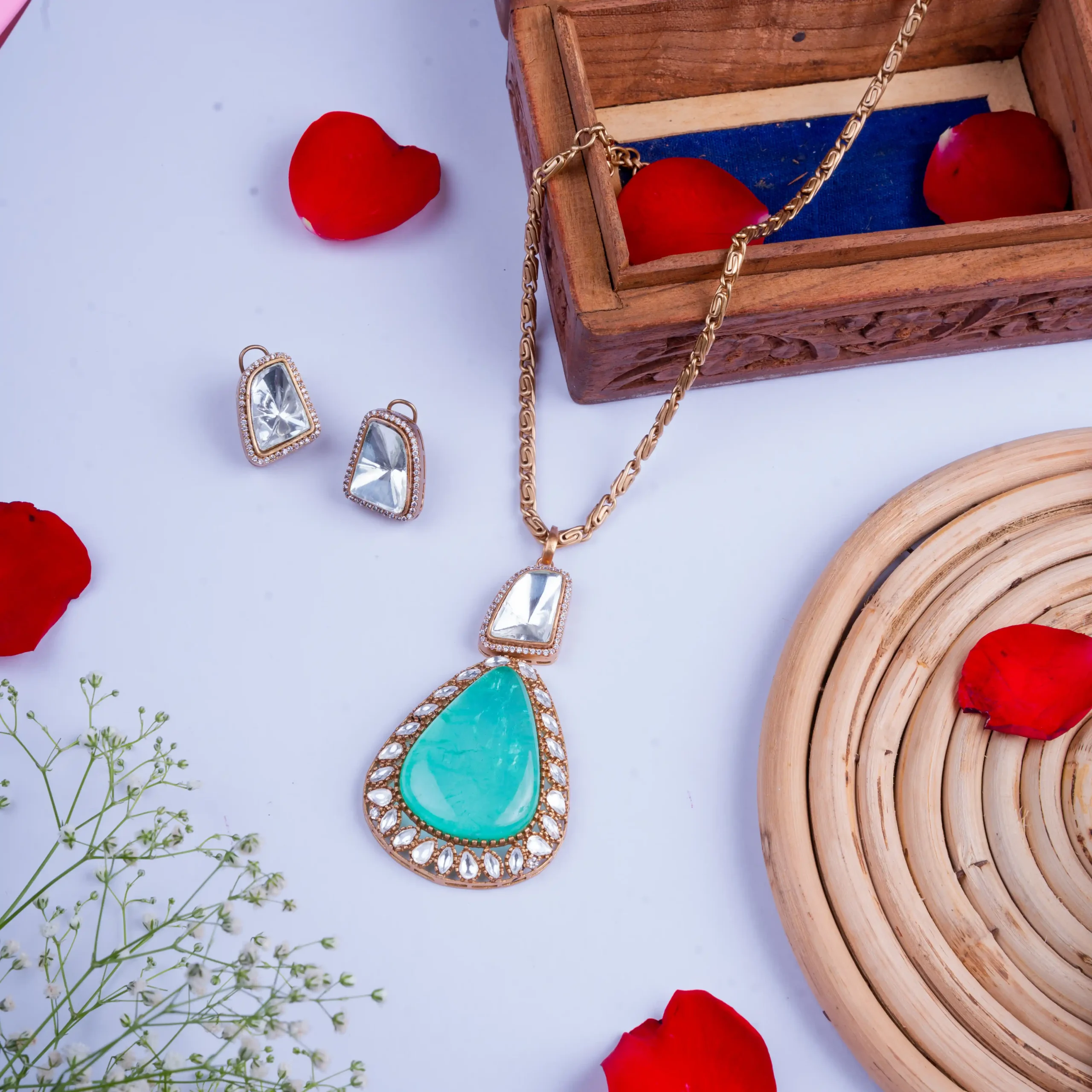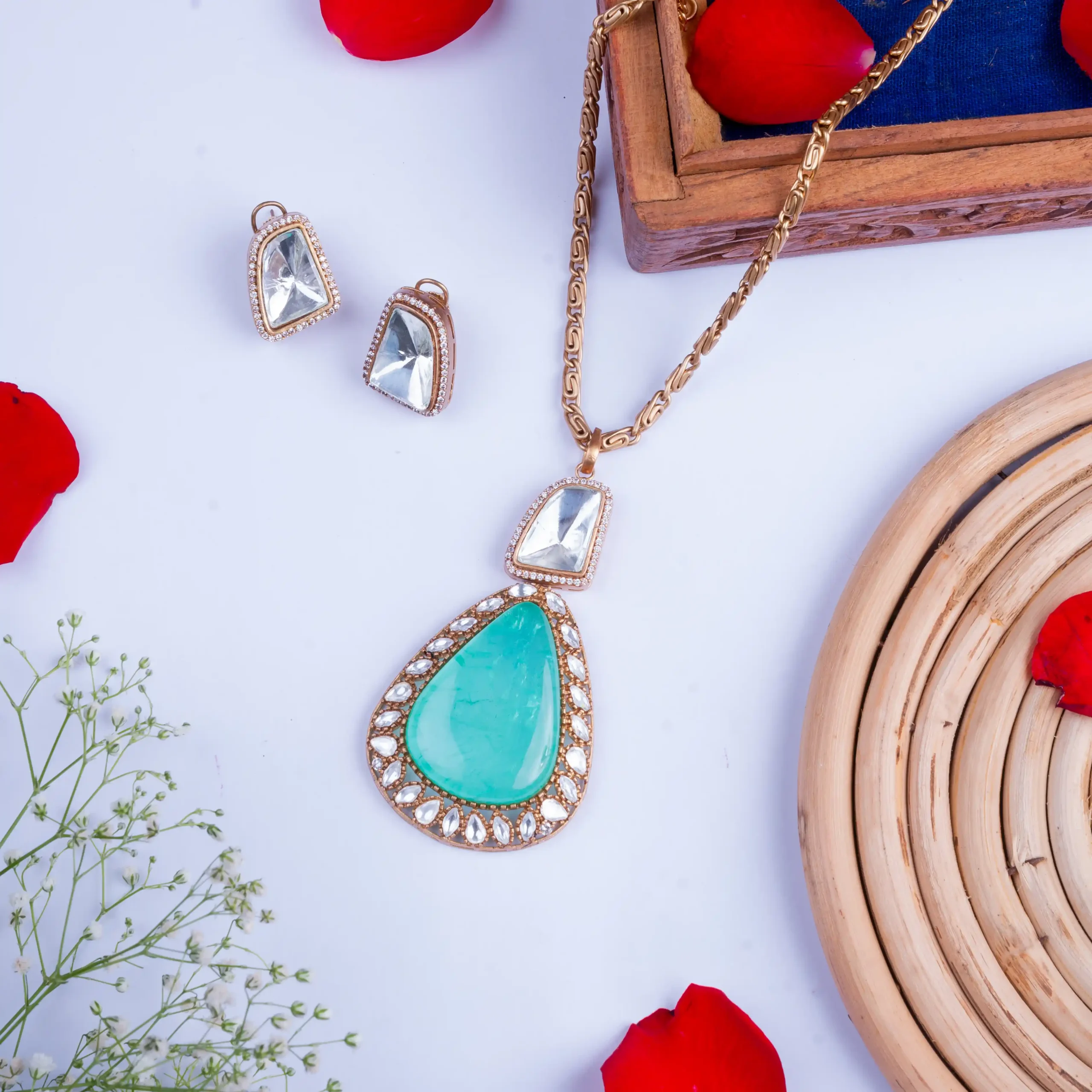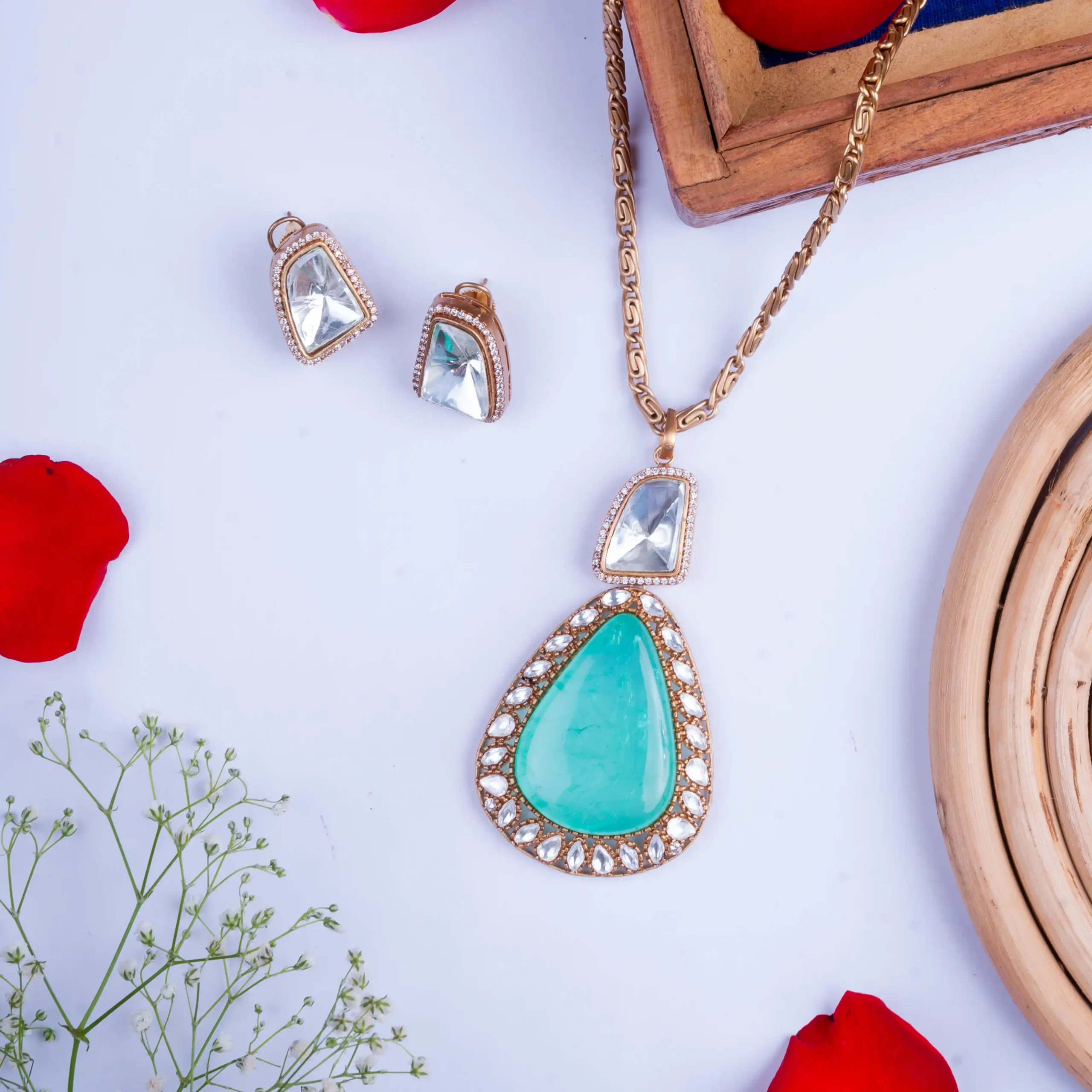 Bold. Regal. Effortless. This emerald-drop pendant set brings royal charm with a clean modern edge—designed for women who don’t wait for crowns, they claim them.