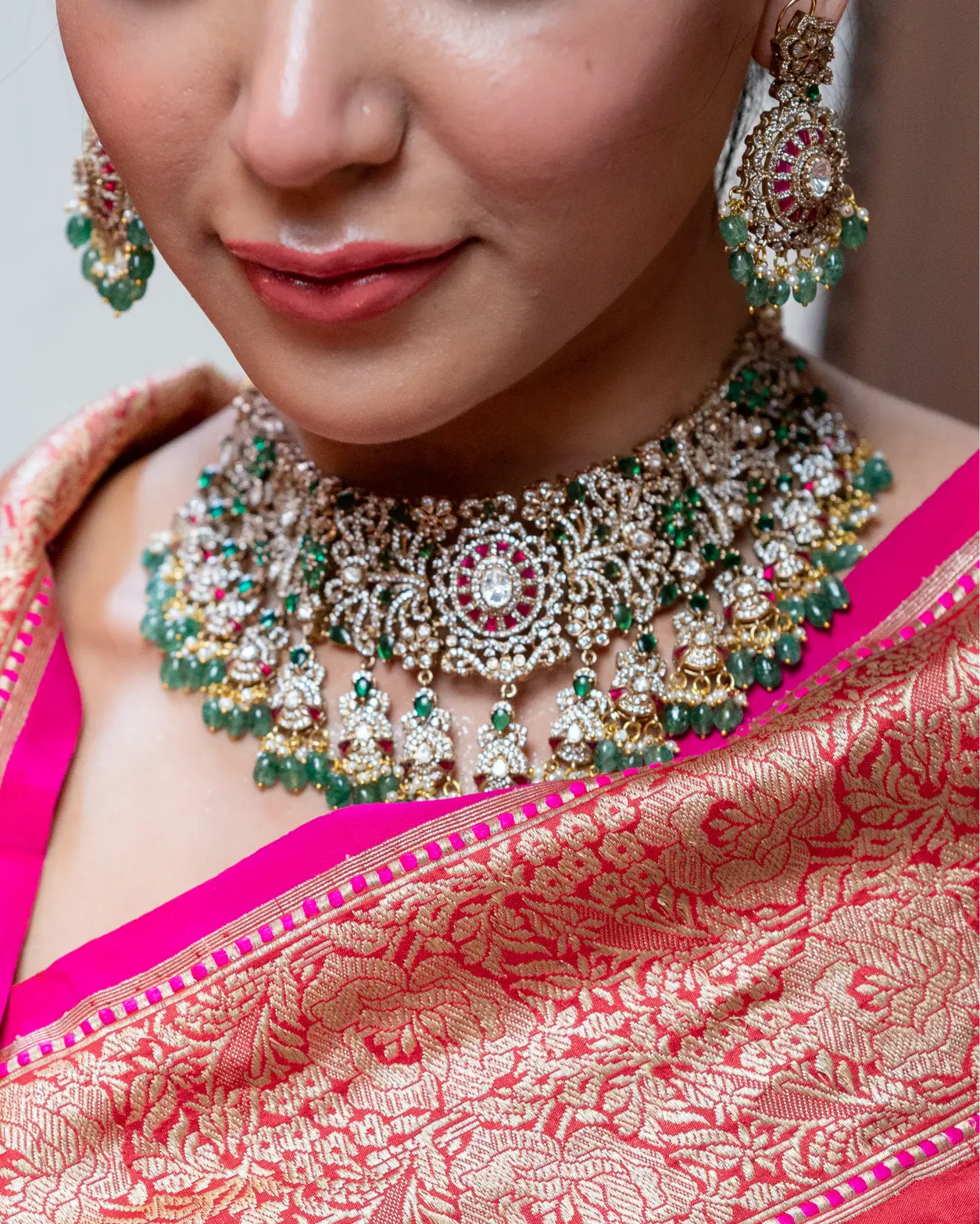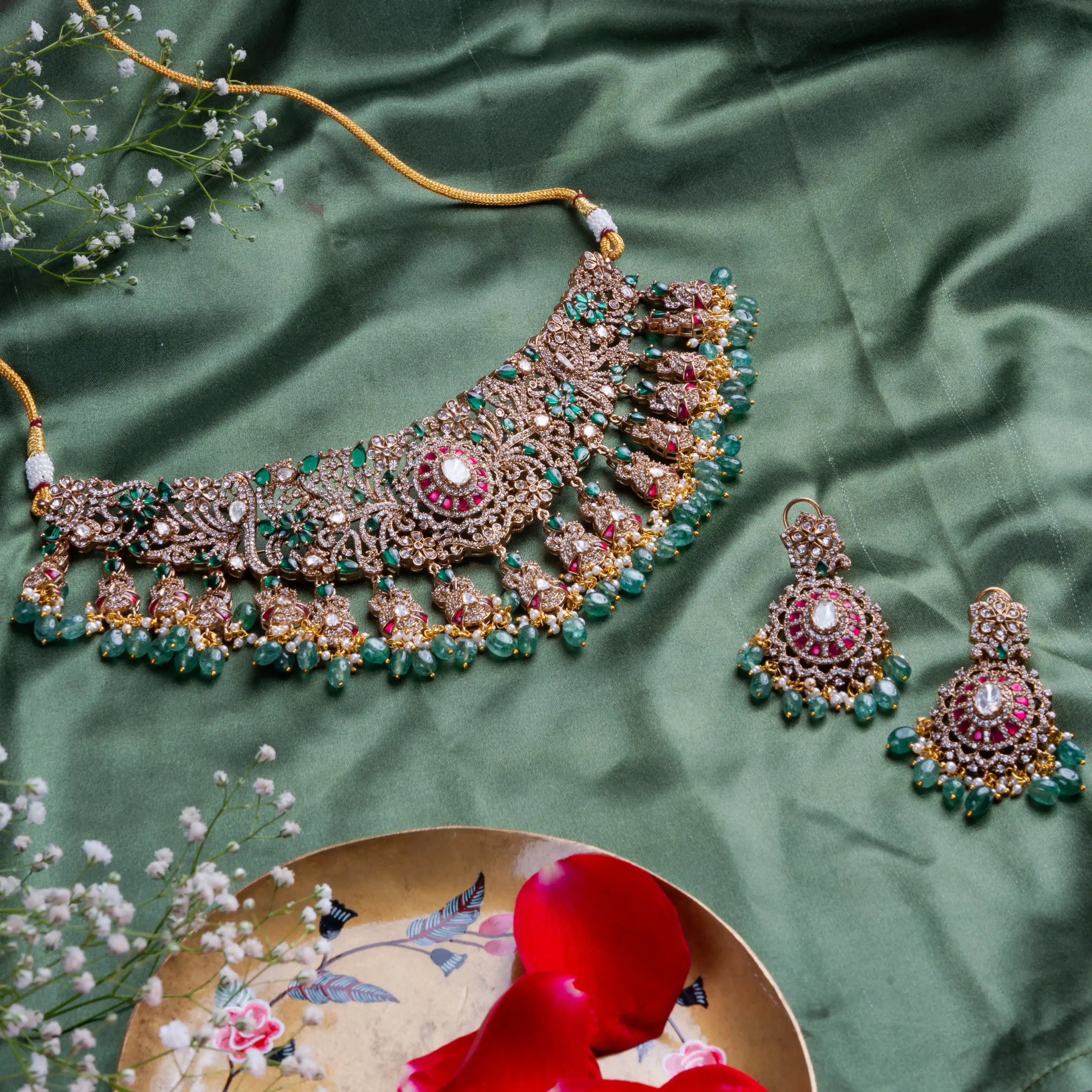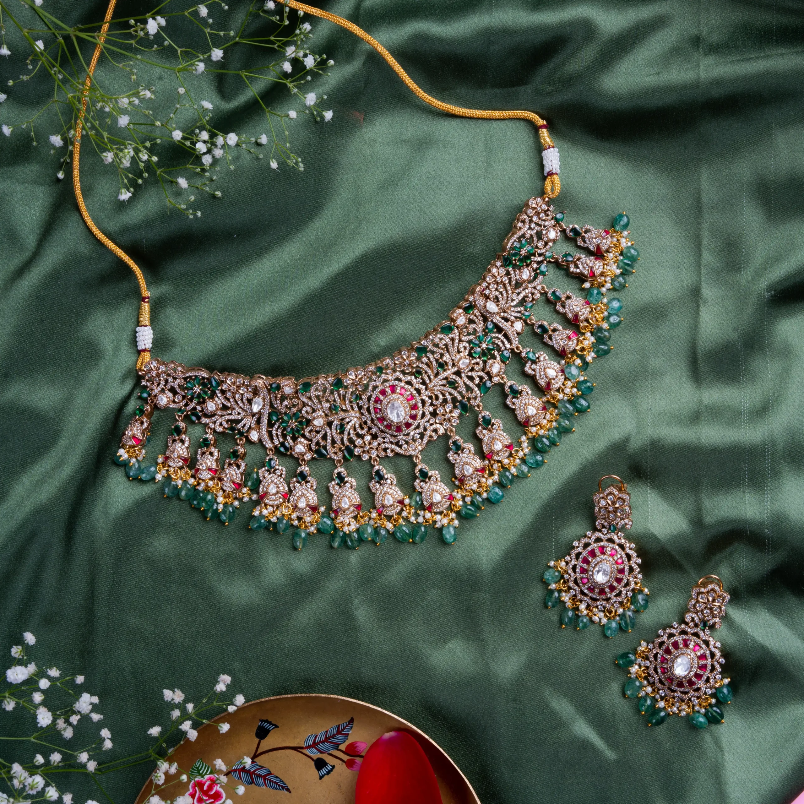The Royal Scandal Necklace Set isn?t subtle?it steals the spotlight. Handcrafted with deep ruby stones, Swarovski crystals, emerald drops and CZ brilliance set in rich gold-plated alloy, it delivers unapologetic glamour. Finished with an adjustable golden zari thread and matching statement earrings, this piece brings royal drama to every look.