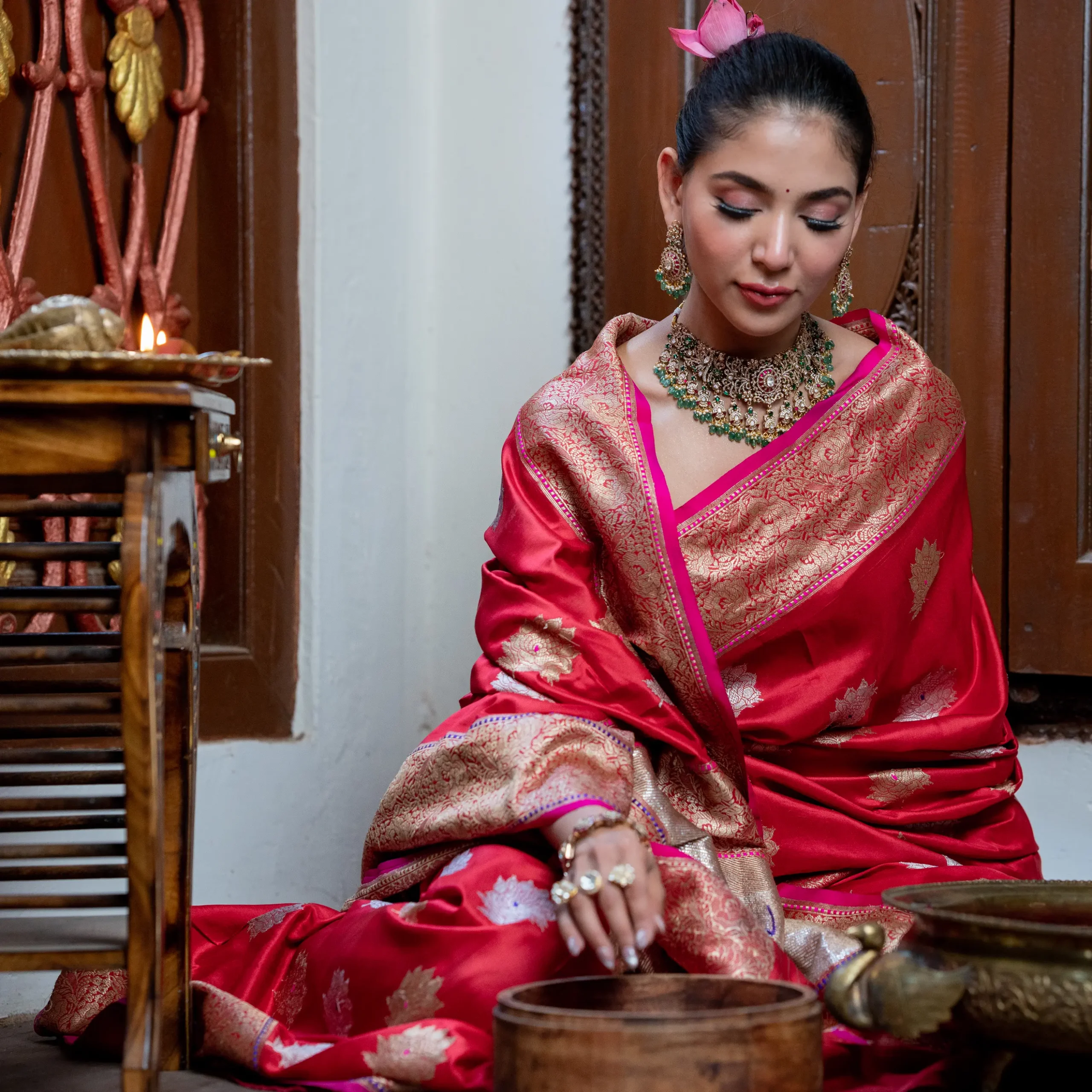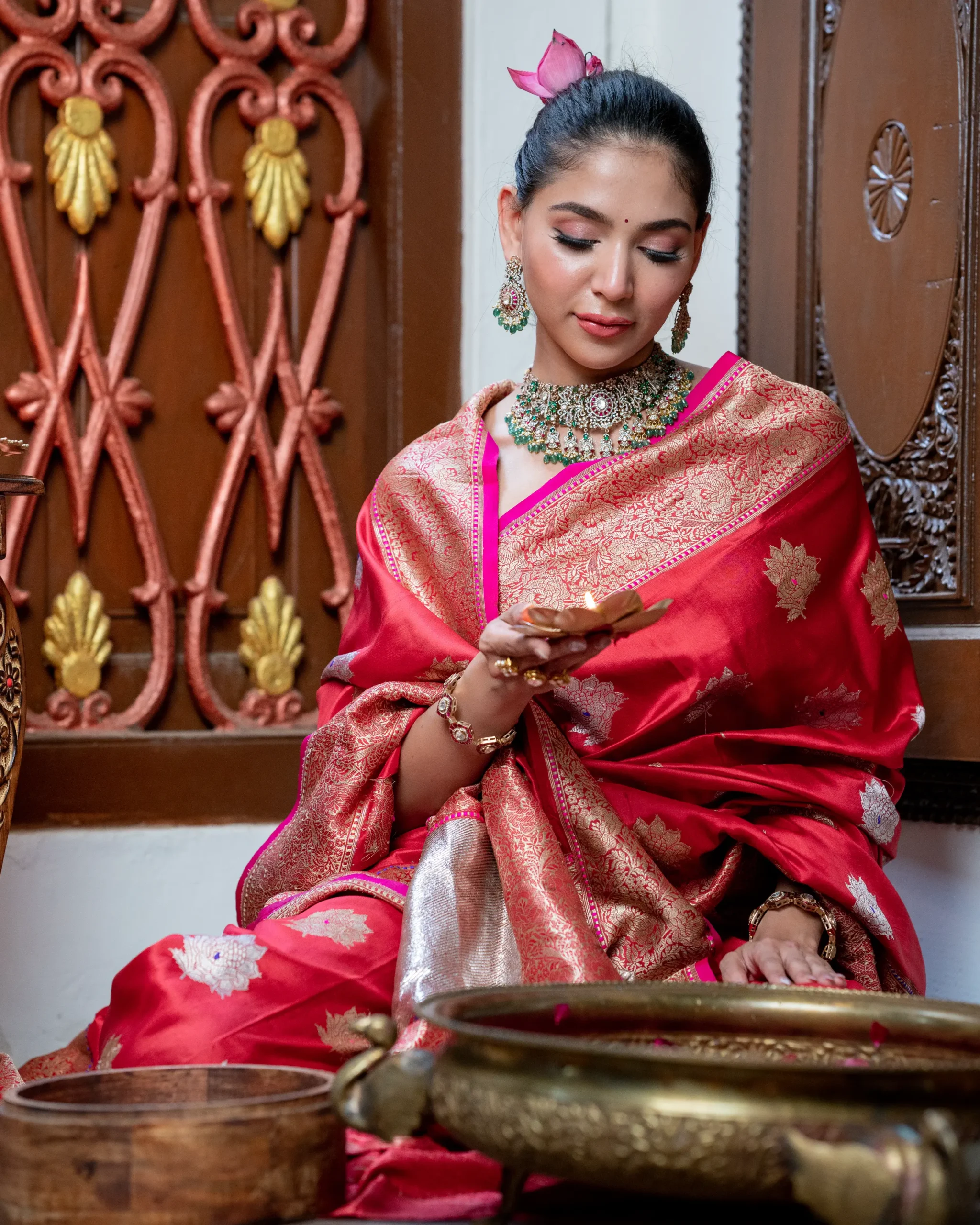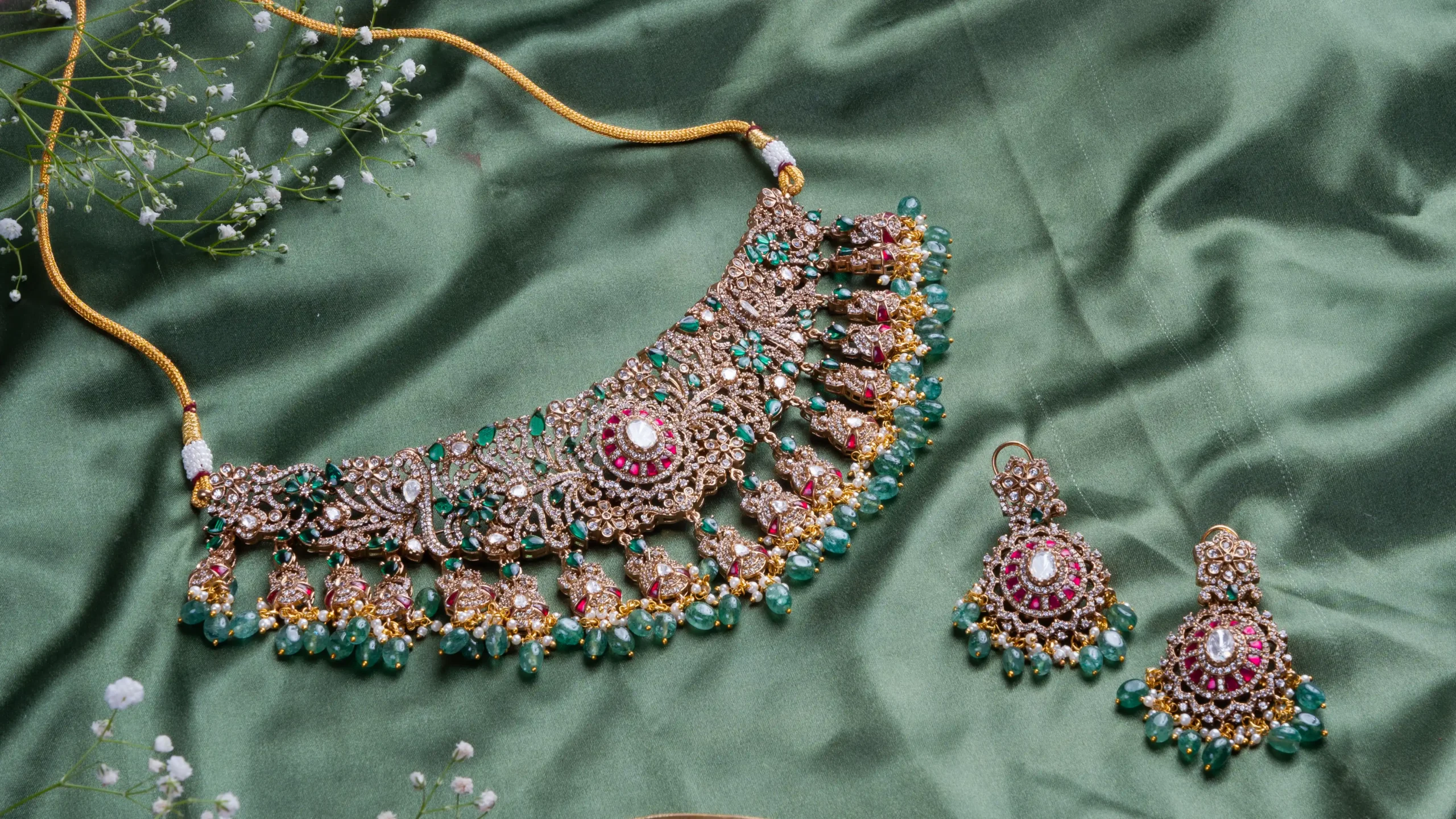 The Royal Scandal Necklace Set isn?t subtle?it steals the spotlight. Handcrafted with deep ruby stones, Swarovski crystals, emerald drops and CZ brilliance set in rich gold-plated alloy, it delivers unapologetic glamour. Finished with an adjustable golden zari thread and matching statement earrings, this piece brings royal drama to every look.